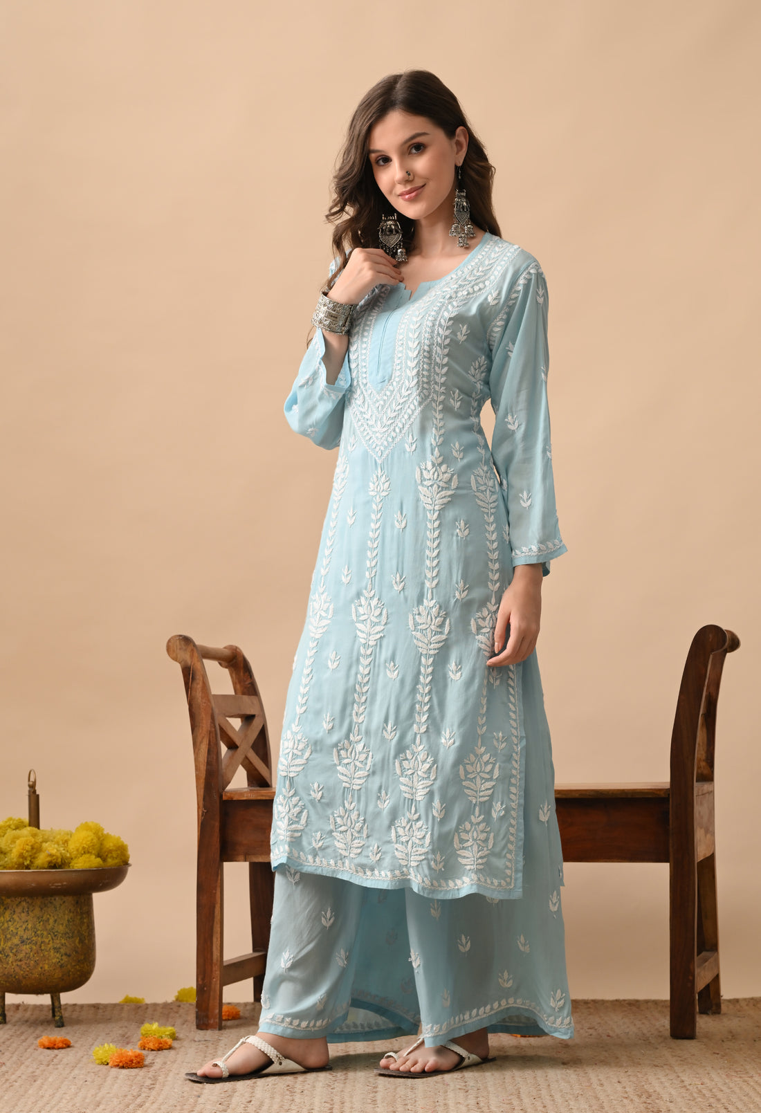Hand-embroidered Lucknowi Chikankari Kurta Plazo Set – Teal & White