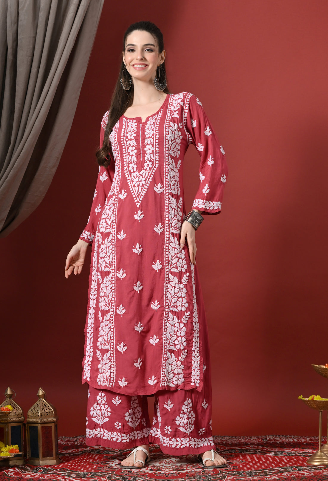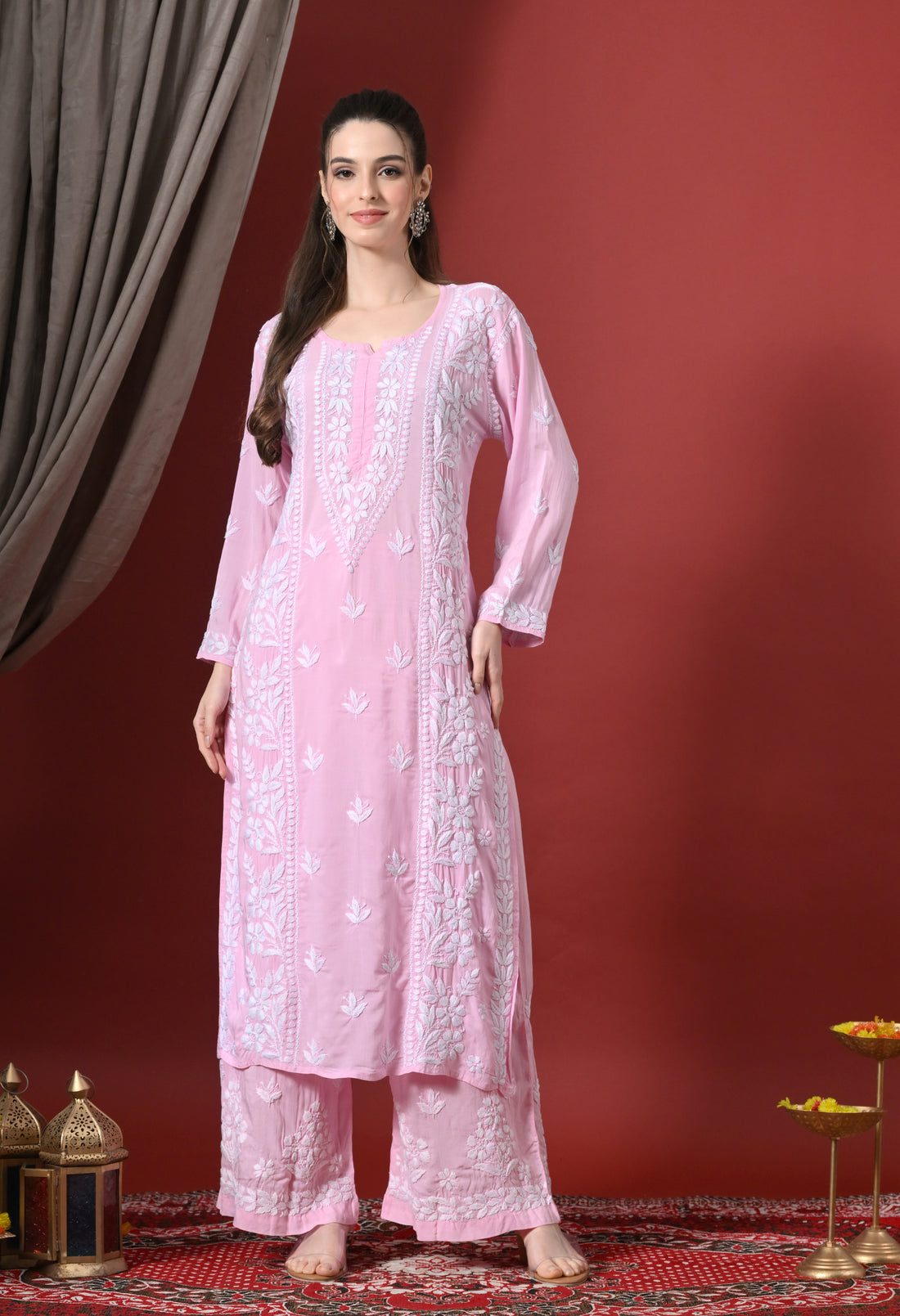 Premium Modal Chikankari Embroidered Set - Onion Pink