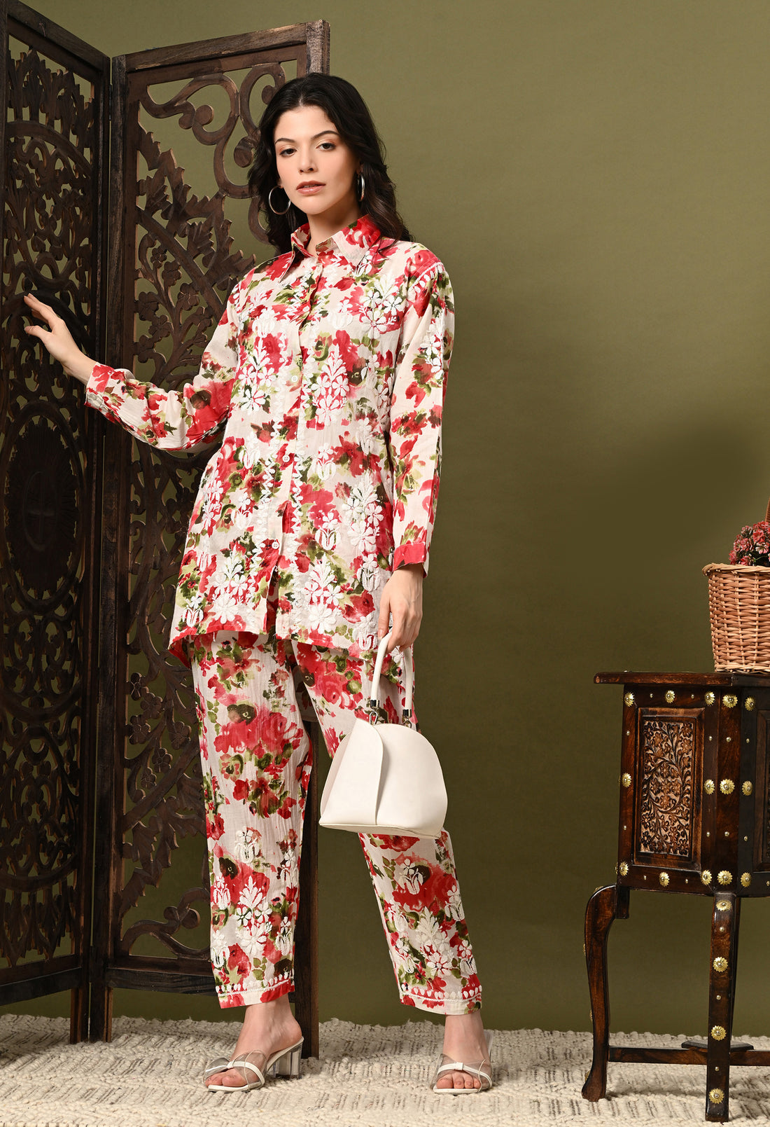 Chikankari Cord Set in Mulmul Set - Floral Print Red
