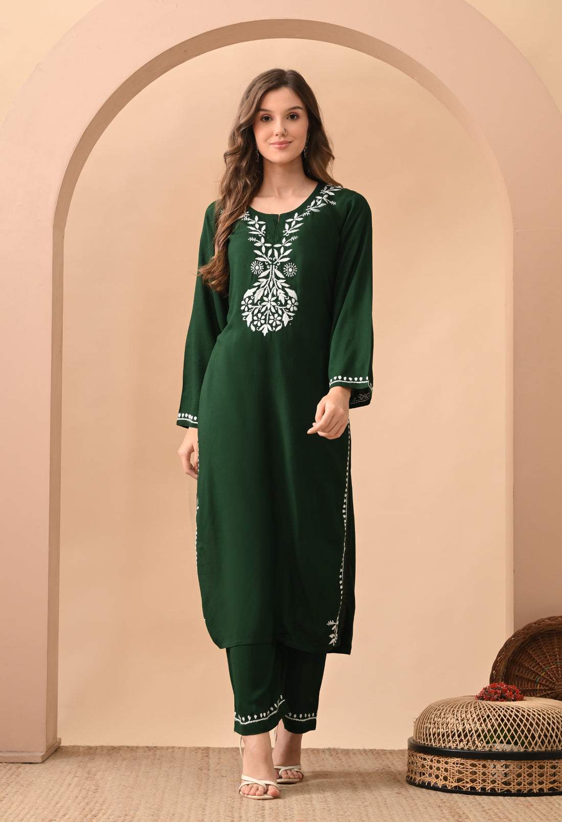 Syrish Rayon Chikankari Kurta & Pant Set Traditional Lucknowi Craft with 3D Hand Embroidered Floral...