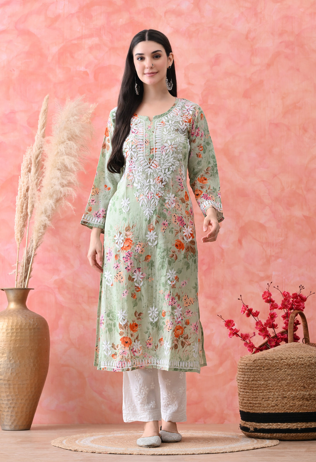 Floral Print Mulmul Pure Cotton Lucknow Chikankari Kurta - Green & White