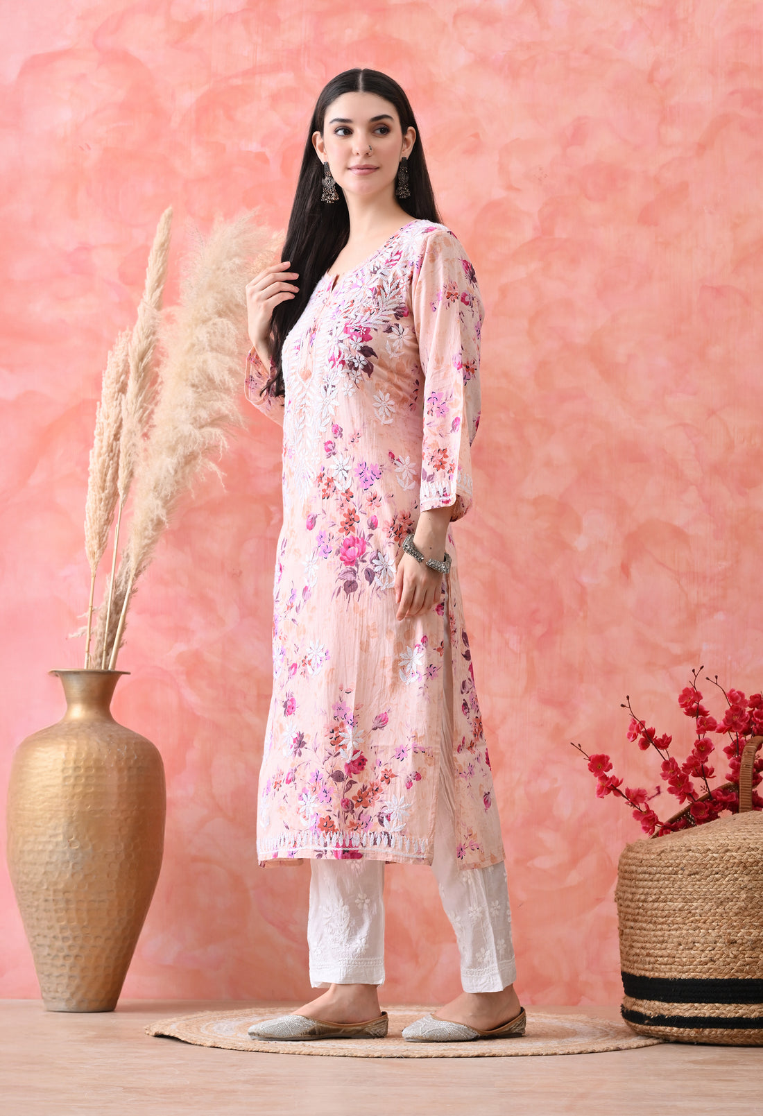Peach-Embroidered Rayon Chikankari Straight Kurta