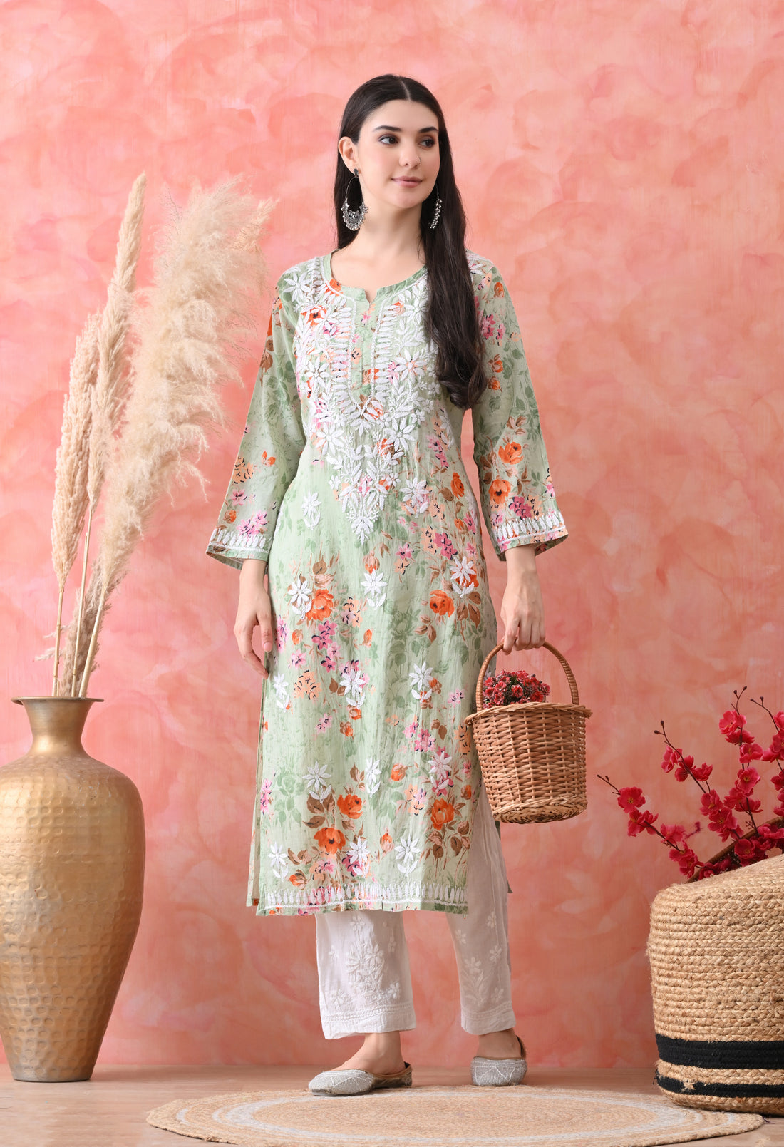 Floral Print Mulmul Pure Cotton Lucknow Chikankari Kurta - Light Green