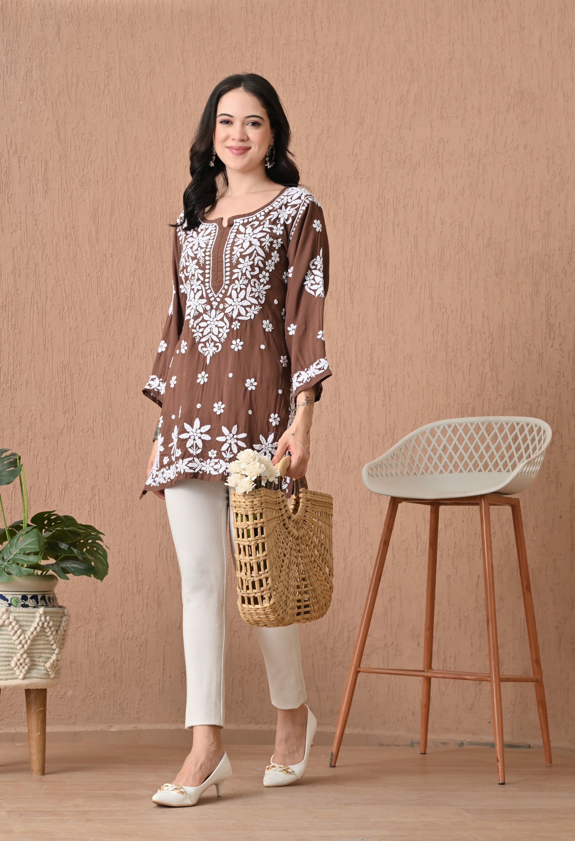 Delicate and detailed handwork inspired by the timeless Lucknowi tradition.Flattering Short Kurta Style: A modern silhouette that pairs effortlessly with jeans, palazzos, or skirts.Comfortable Fabric: Soft, skin-friendly material ideal for all-day wear in any season.Suitable for casual outings, festive gatherings, or work wear.