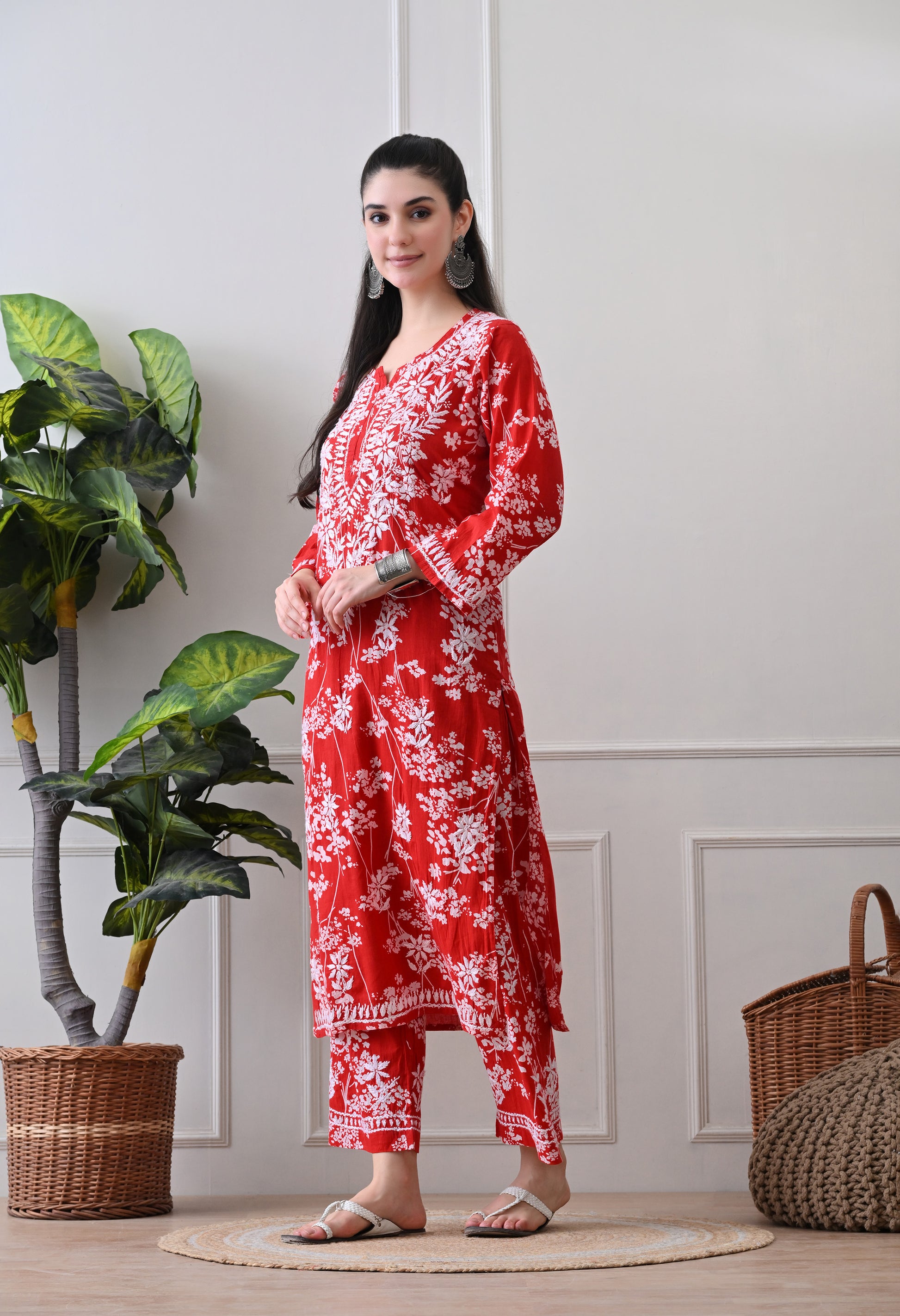 Hand Embroidered Chikankari Mulmul Plazo Set – Floral Delight Red