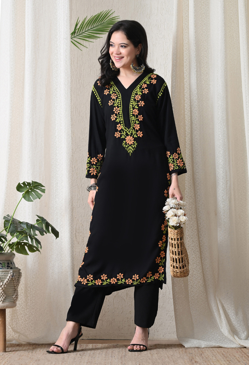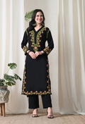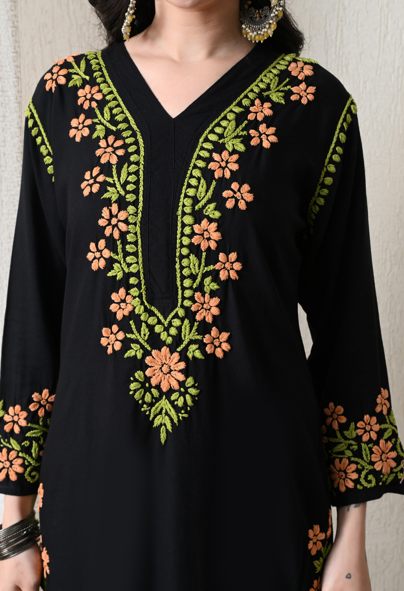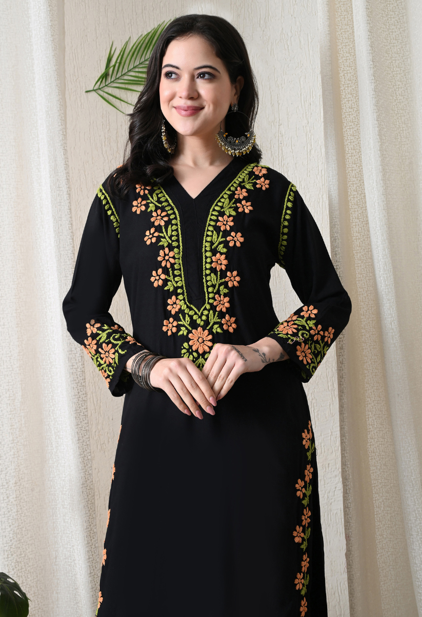 Elevate your ethnic wardrobe with this elegant black Chikankari kurta, crafted from premium rayon fabric for a soft, breathable, and comfortable feel. The deep black base provides the perfect canvas for the intricate artistry of Lucknowi craftsmanship.