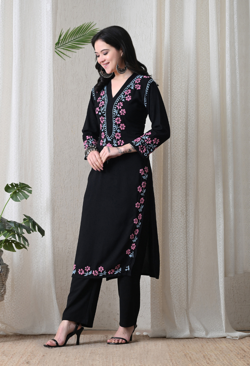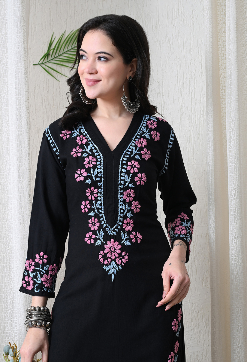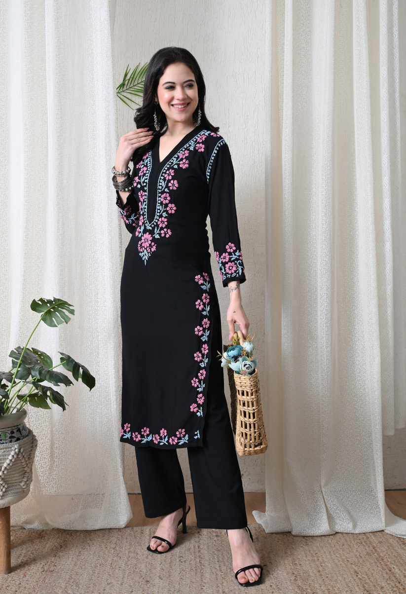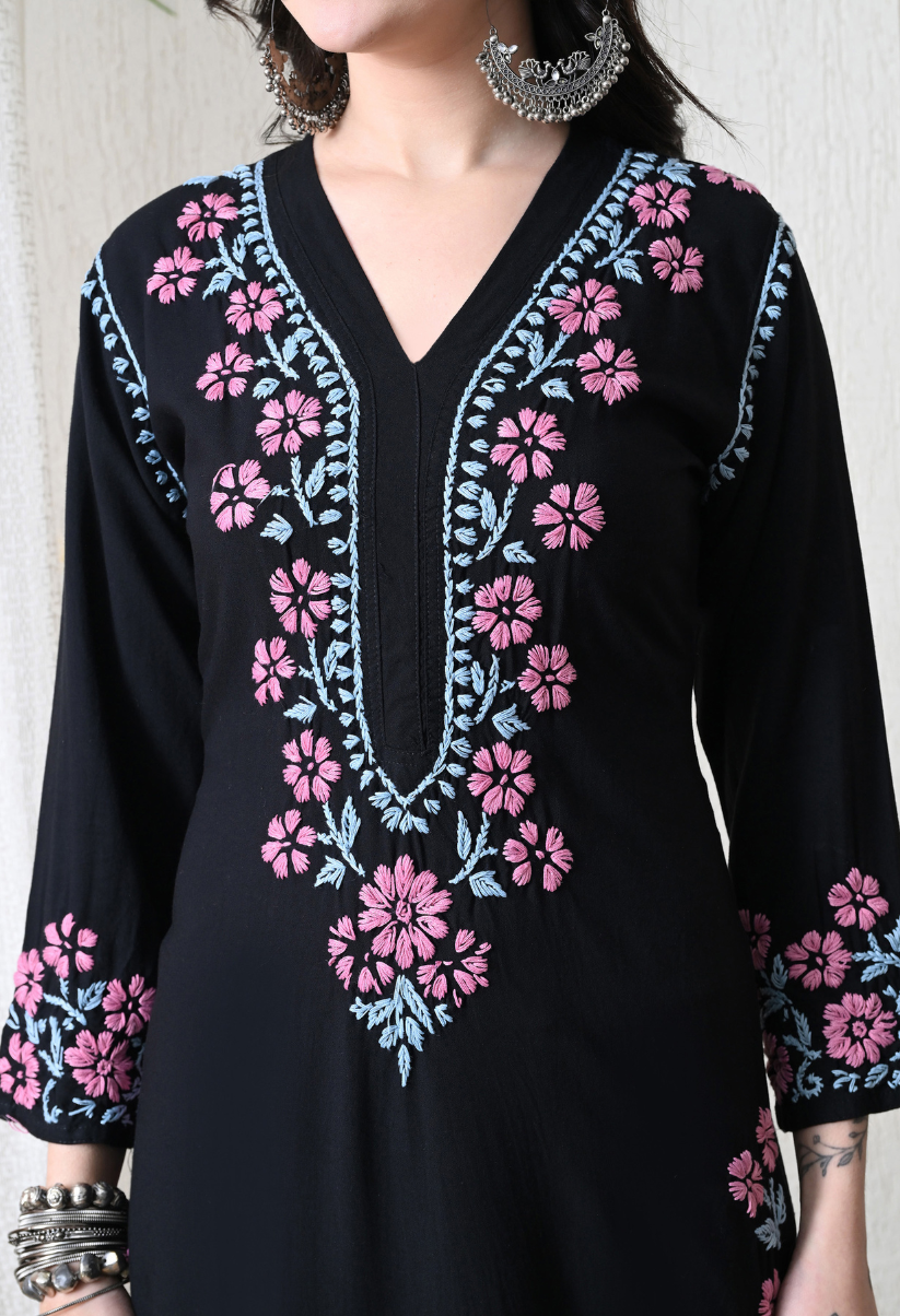 Black Hand Embroidered Chikankari Rayon Kurta