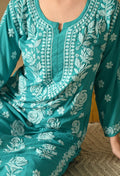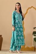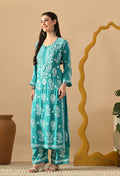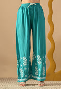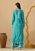 Hand Embroidered Chikankari Slub Rayon Plazo Set 3d Work-Firozi