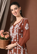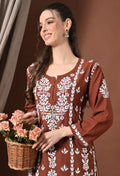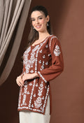 Lucknowi Chikankari Short Kurta in Rayon – Brown & White Floral Embroidery