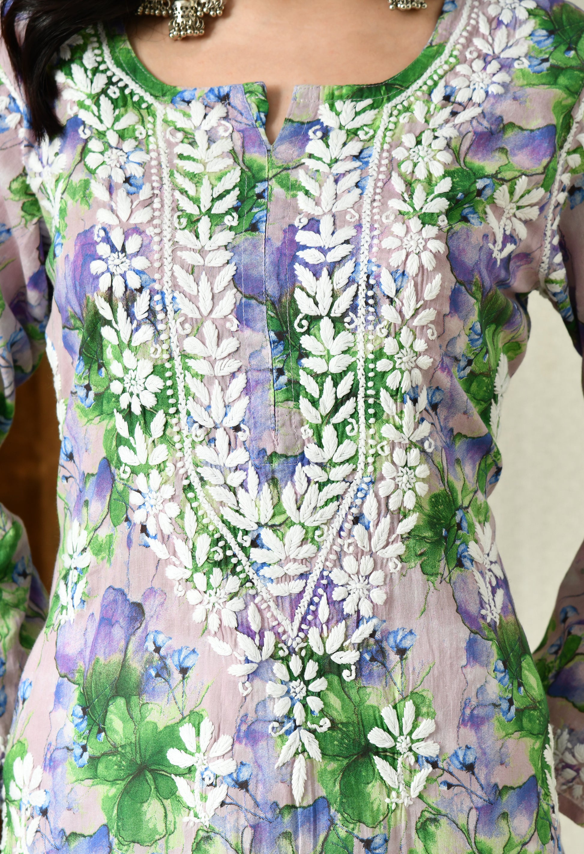 Multi color Mulmul Pure Cotton Lucknow Chikankari Kurta -Green