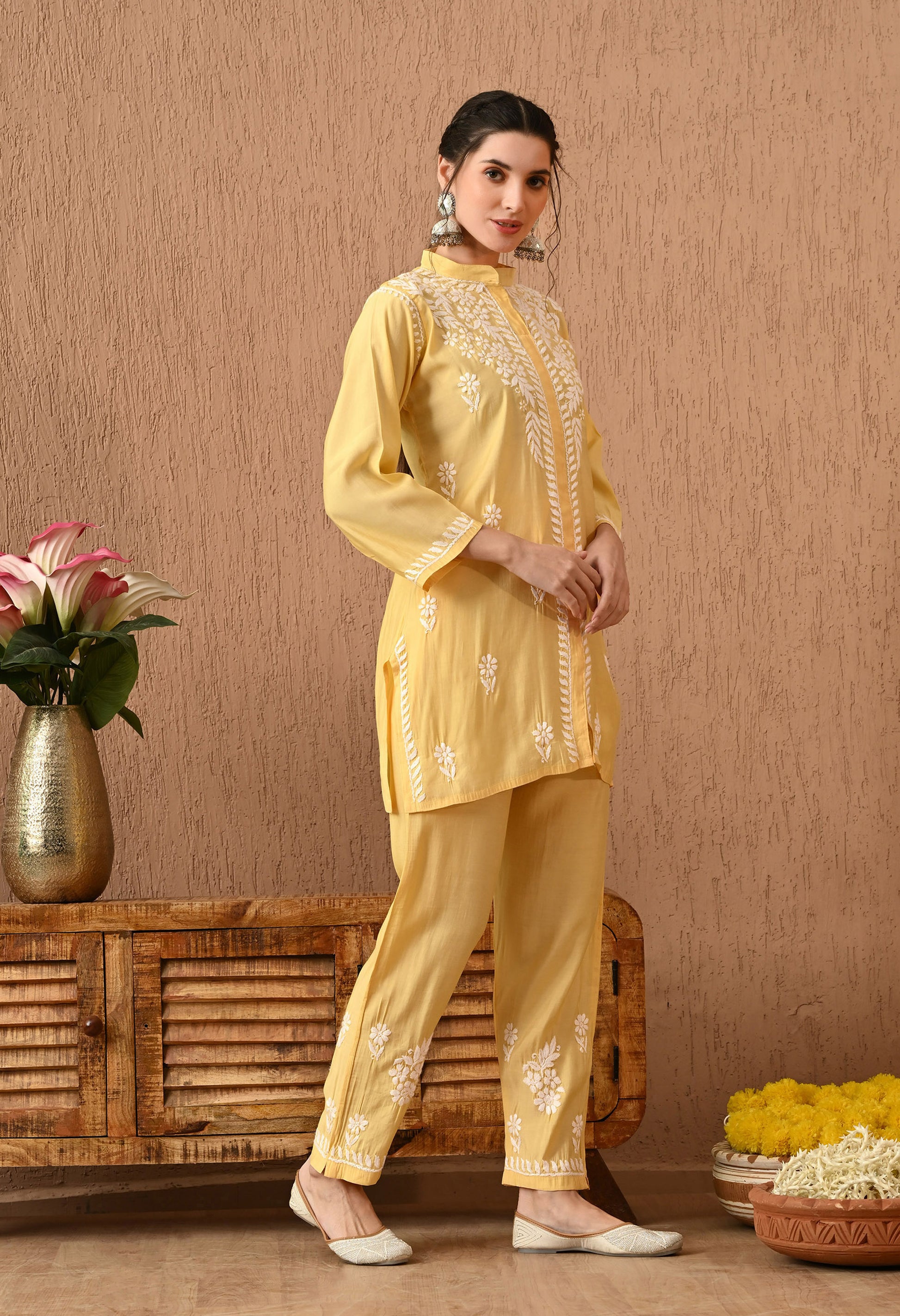 The intricate chikankari embroidery transforms the tunic into a masterpiece, showcasing impeccable craftsmanship that adds an ethereal touch to your ensemble. The enchanting shade of Yellow is not just chosen for its visual appeal but also for its ability to complement a diverse range of Roman Silk tones, allowing you to radiate confidence and style effortlessly.