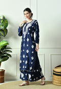 Elevate your ethnic wardrobe with this Navy Blue Modal Chikankari Set, a masterpiece of elegance and craftsmanship. Hand embroidered with traditional Chikankari work, the set features delicate cutwork detailing that adds depth and sophistication to the design. Crafted on premium Modal fabric, it offers a luxurious drape with a soft, breathable feel for all-day comfort.
