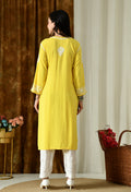 The bright yellow hue brings a cheerful, festive charm, while the intricate floral motifs and delicate threadwork add sophistication and depth to the design. The straight-cut silhouette with a rounded V-neckline and full sleeves ensures comfort without compromising on style.