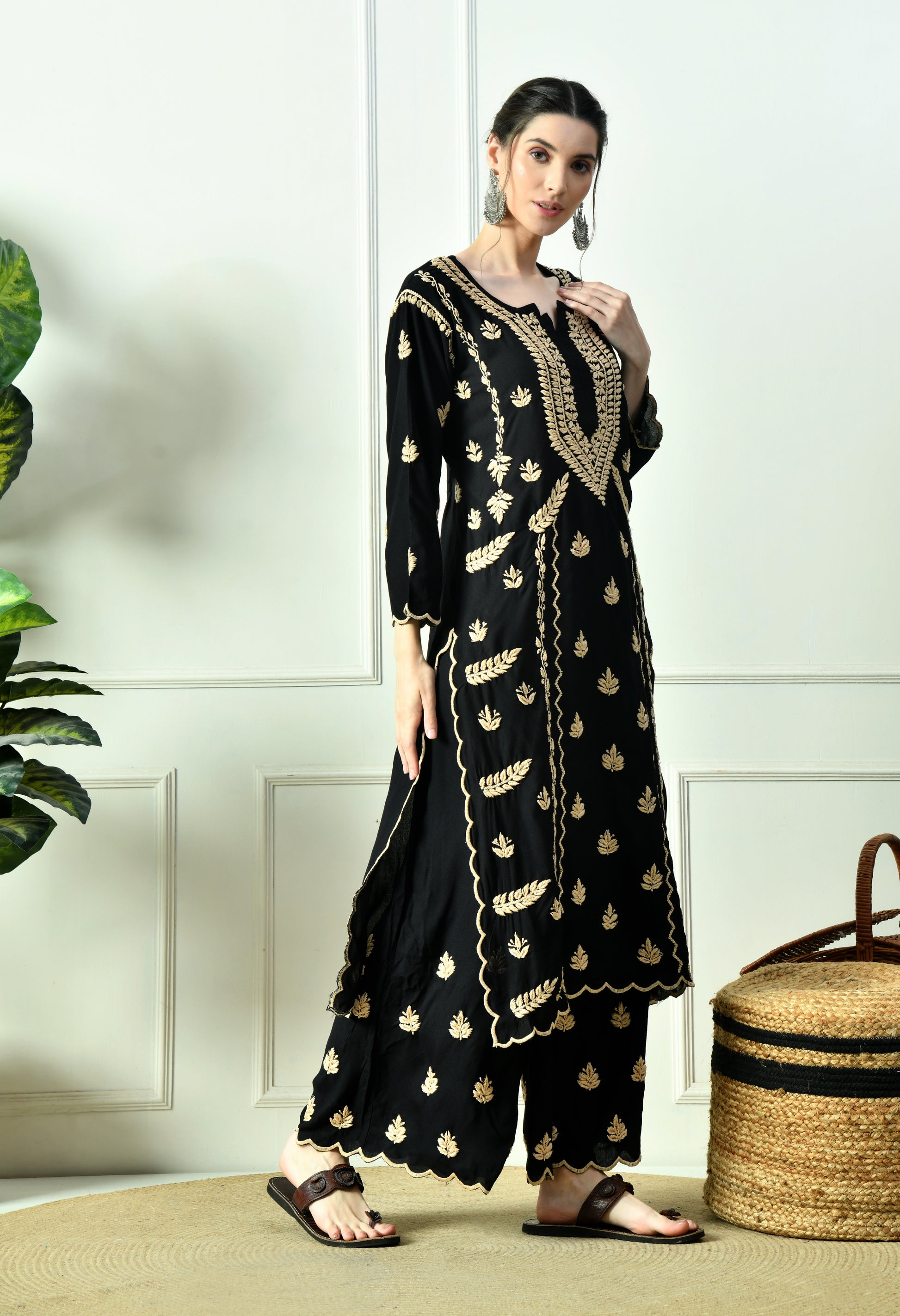 Step into timeless elegance with our Black Beauty Vibrant Chikankari Set, beautifully handcrafted on rich black fabric with striking Brown Chikankari embroidery. The intricate hand embroidery adds a bold yet graceful contrast, making this set a perfect blend of tradition and modern sophistication.