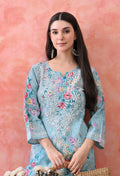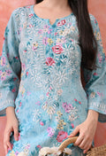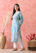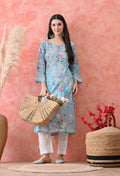 Floral Print Mulmul Pure Cotton Lucknow Chikankari Kurta - Blue