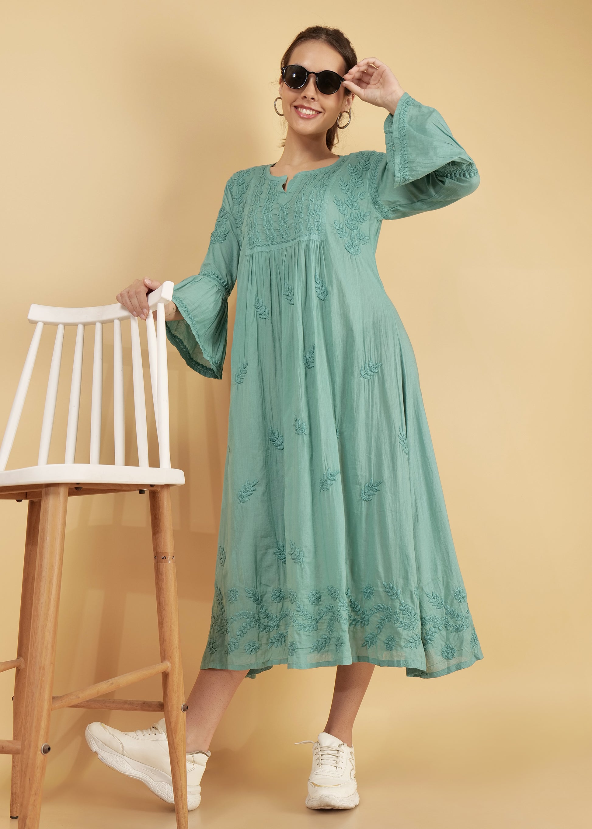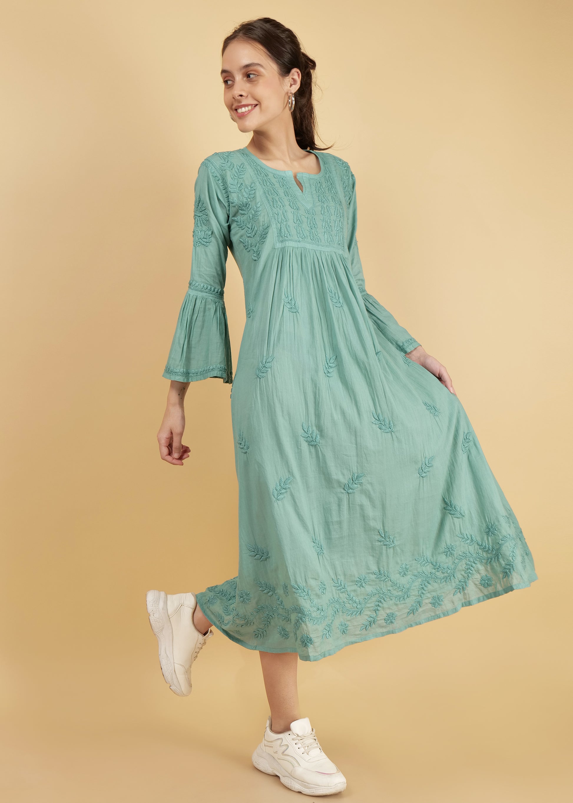 Mulmul Hand Embroidered Knee length Chikankari Dress Green