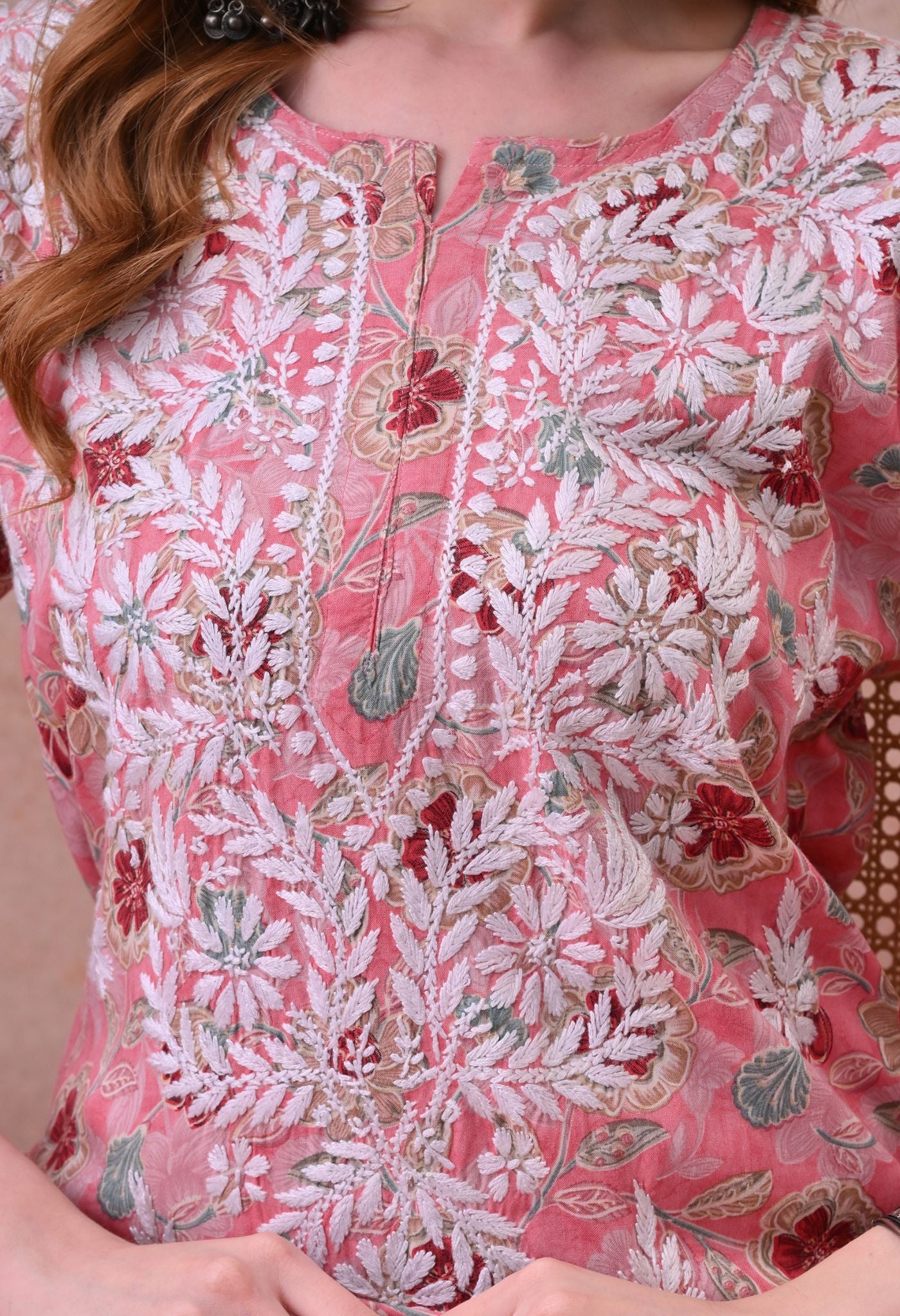 - Intricate hand-embroidered chikankari floral motifs