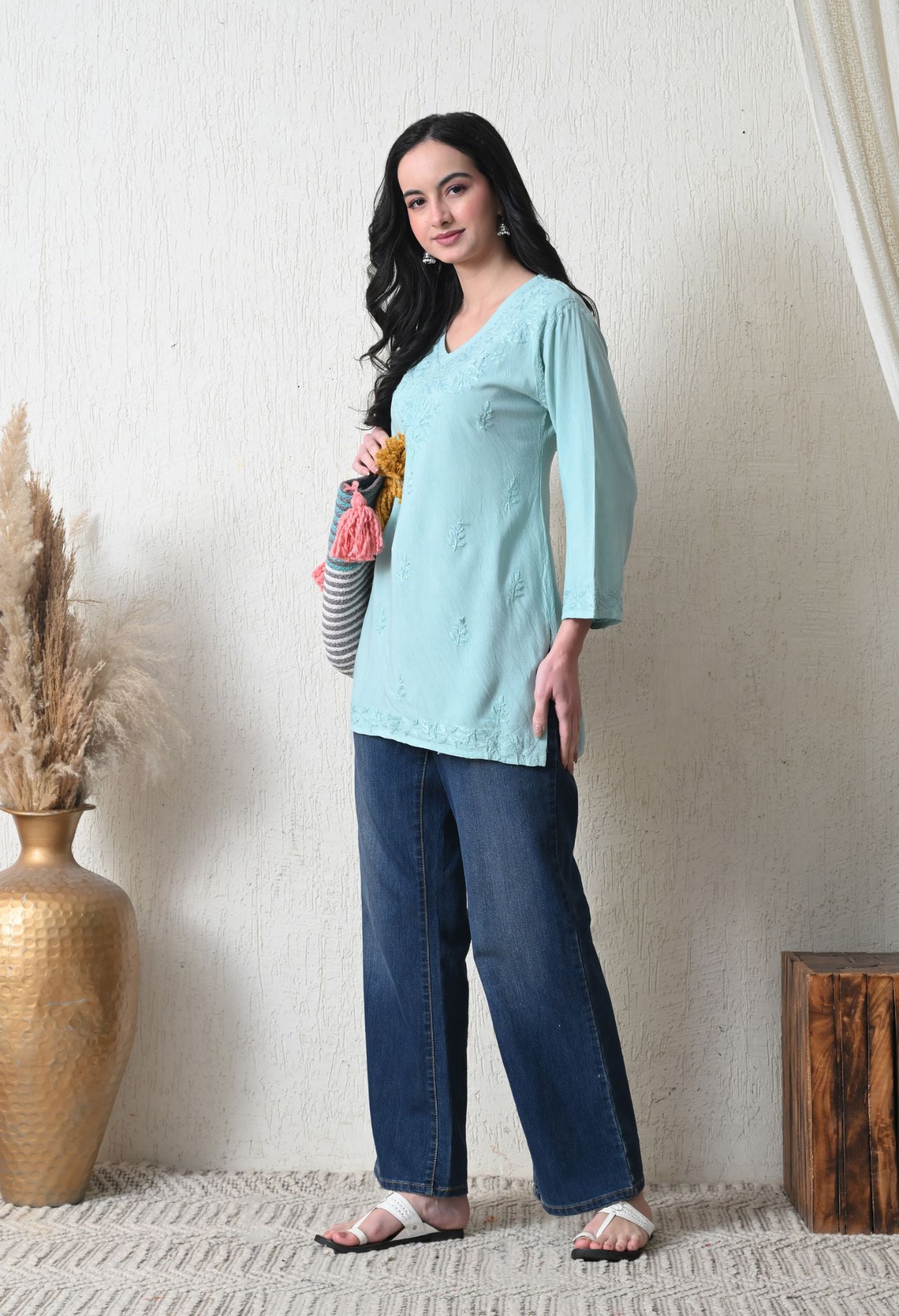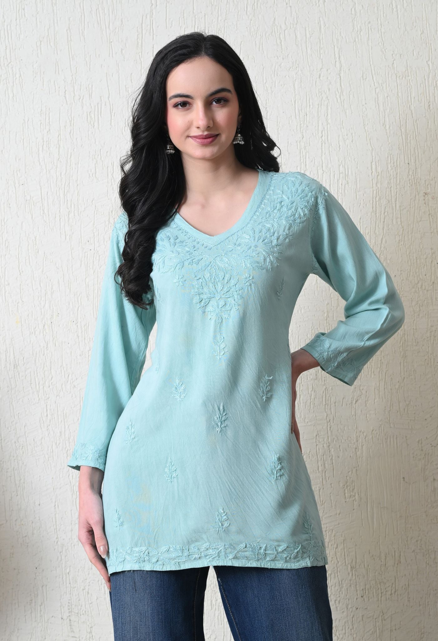 - Premium rayon short kurta with authentic hand-embroidered chikankari work