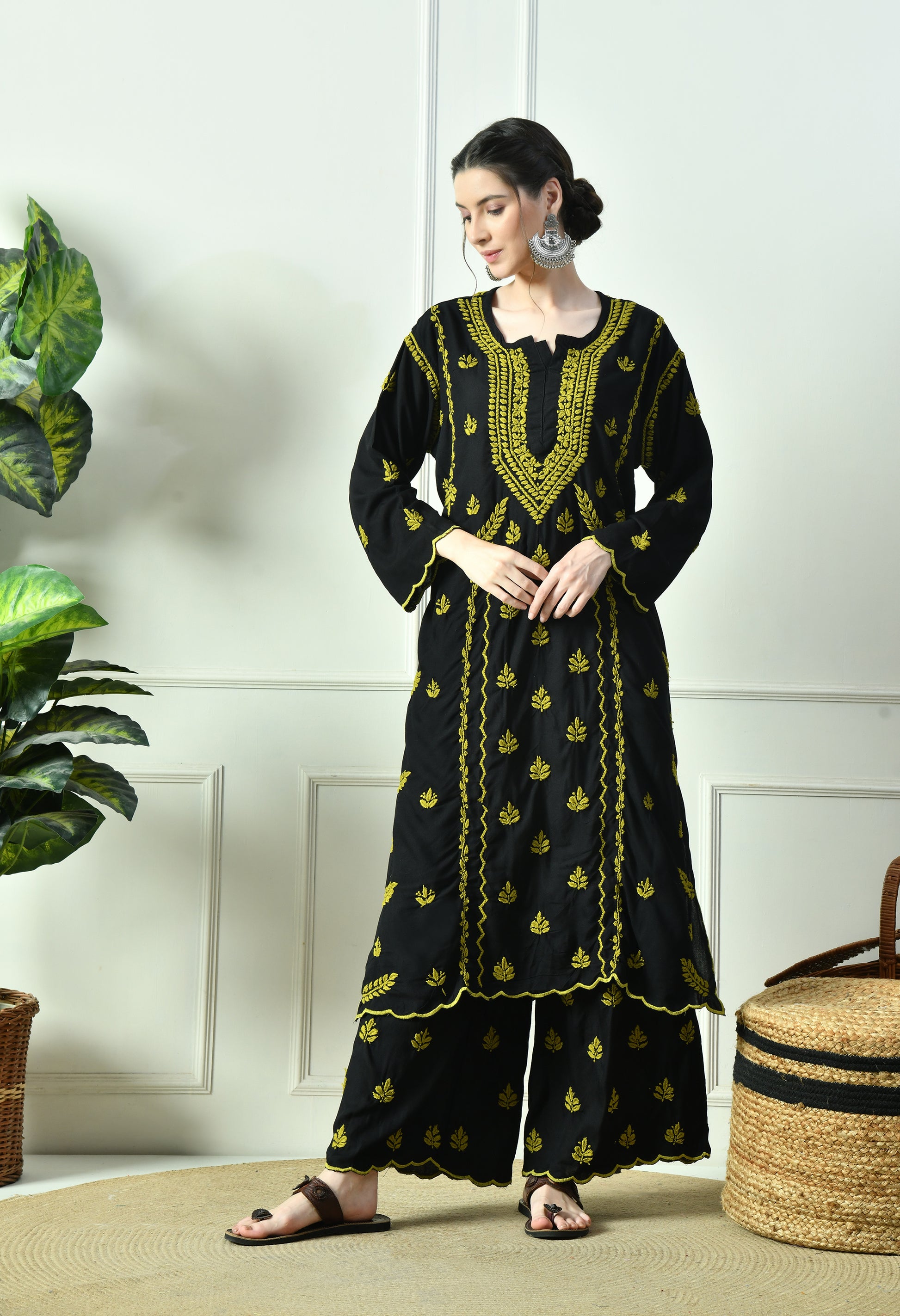 Step into timeless elegance with our Black Beauty Vibrant Chikankari Set, beautifully handcrafted on rich black fabric with striking Green Chikankari embroidery. The intricate hand embroidery adds a bold yet graceful contrast, making this set a perfect blend of tradition and modern sophistication.