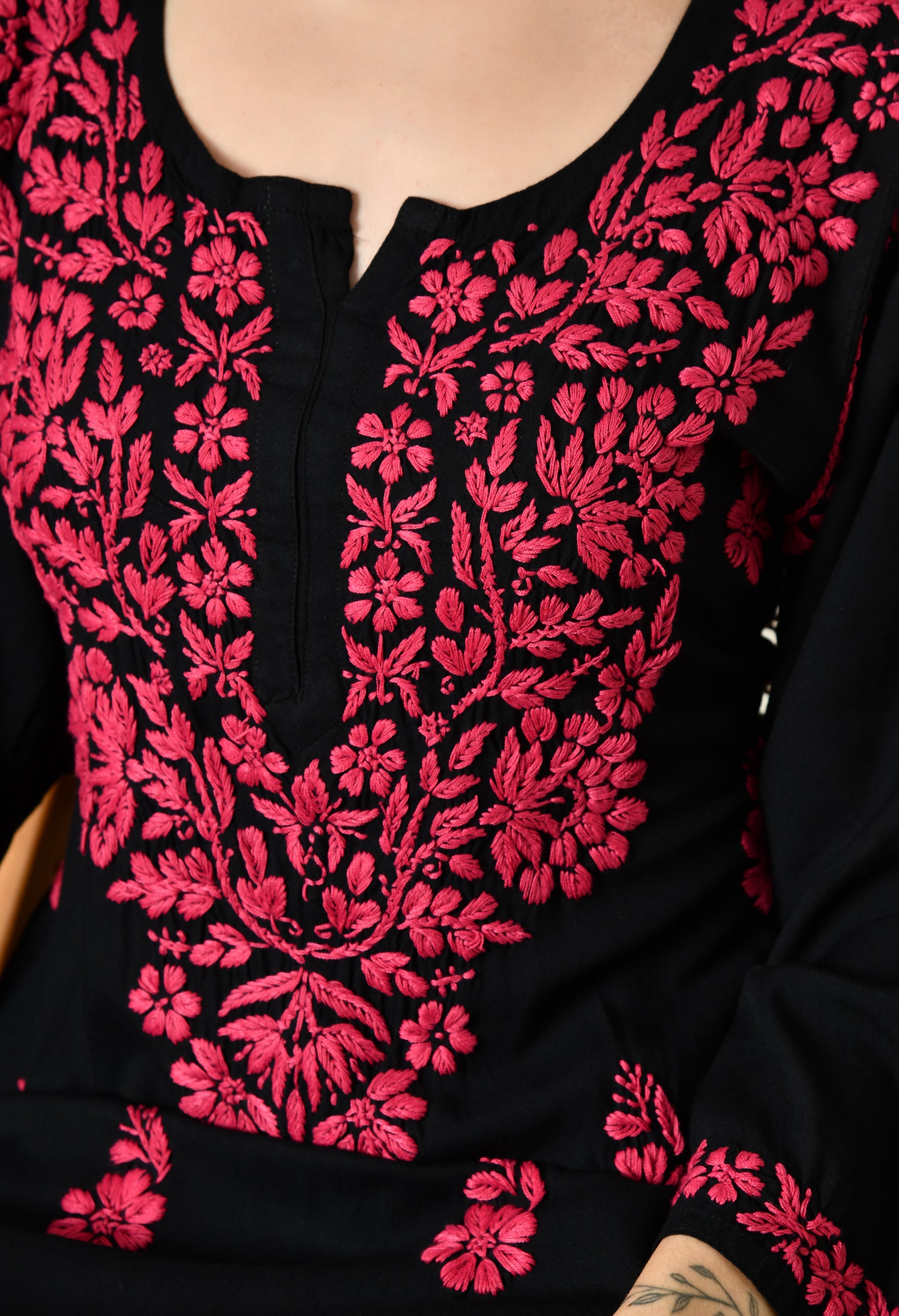 Elevate your ethnic wardrobe with this elegant Black Kurta featuring exquisite colored Chikankari hand embroidery. Crafted from soft and breathable rayon fabric, this kurta offers both comfort and style, making it perfect for everyday wear or festive occasions.