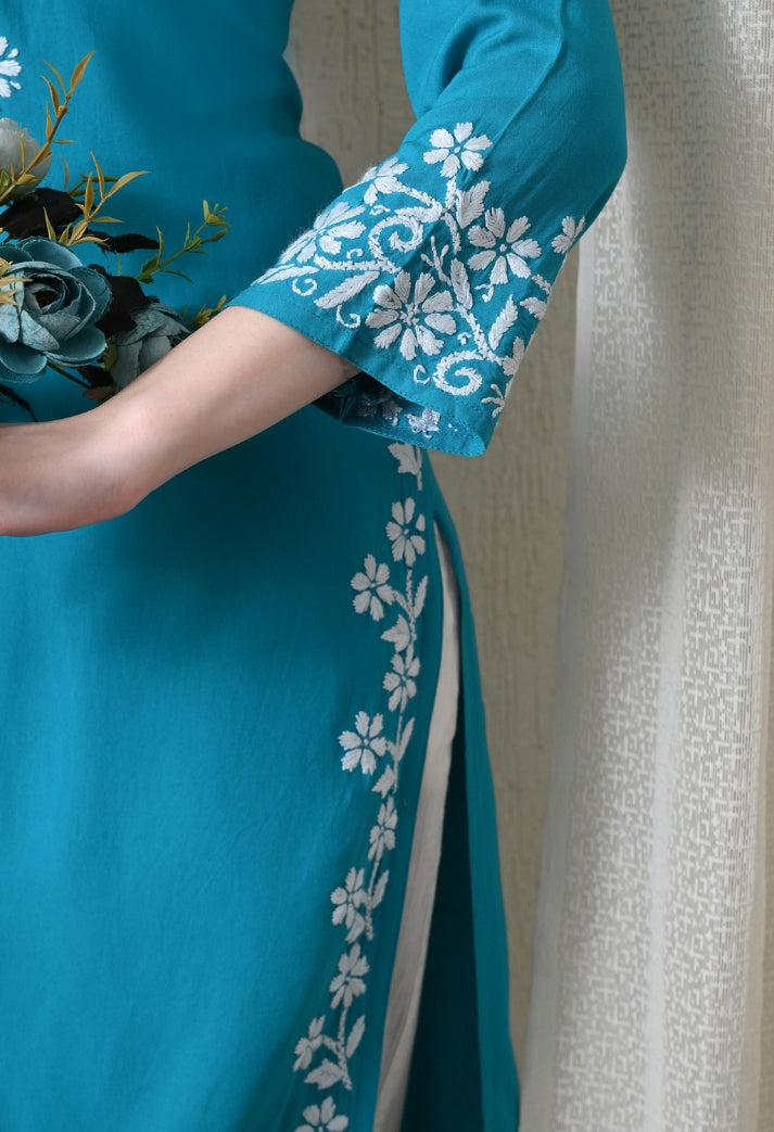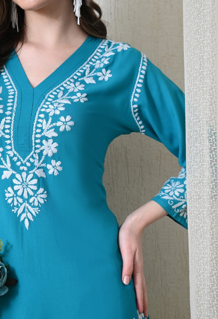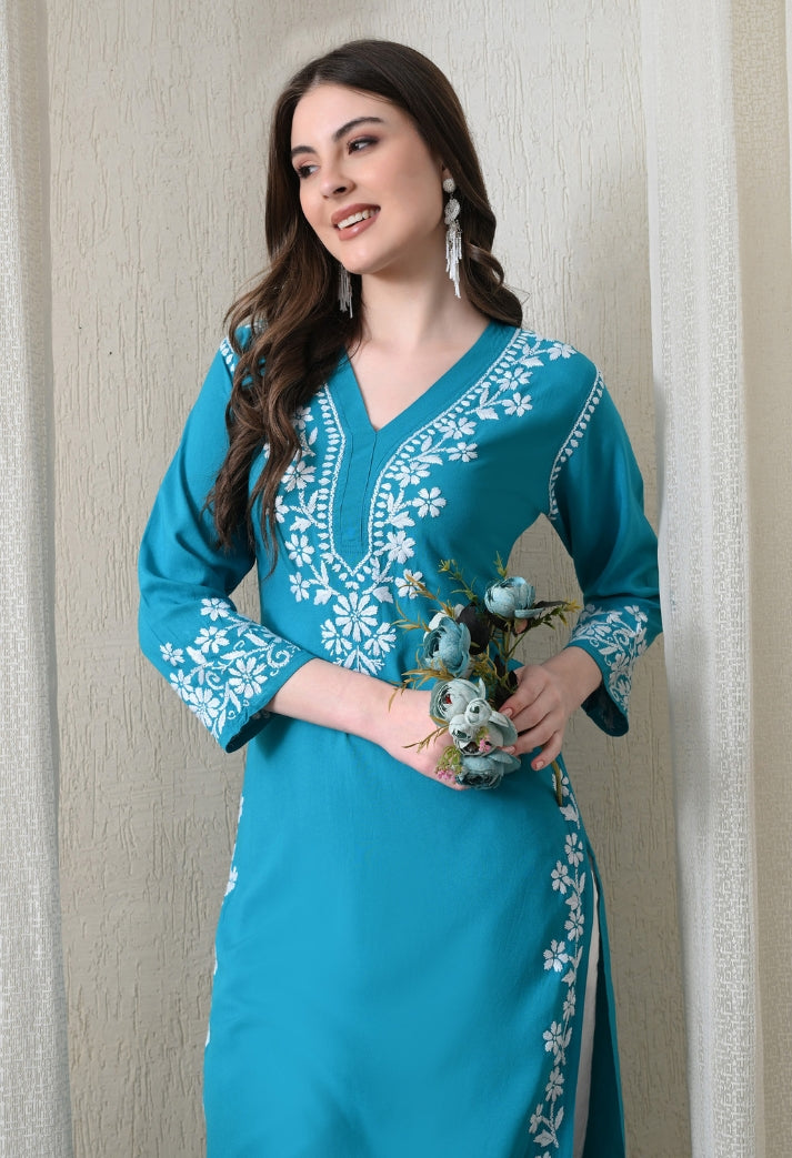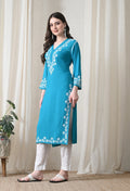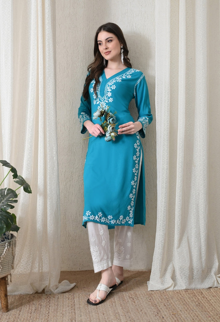 Blue Hand-Embroidered Chikankari Rayon Straight Kurta