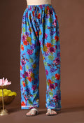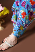 The straight-fit kurta features heavy chikankari embroidery around the neckline, sleeves, and scattered motifs throughout. The matching palazzo bottoms are beautifully detailed with coordinated floral threadwork along the hem, giving the outfit a complete and polished look.