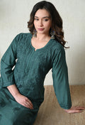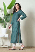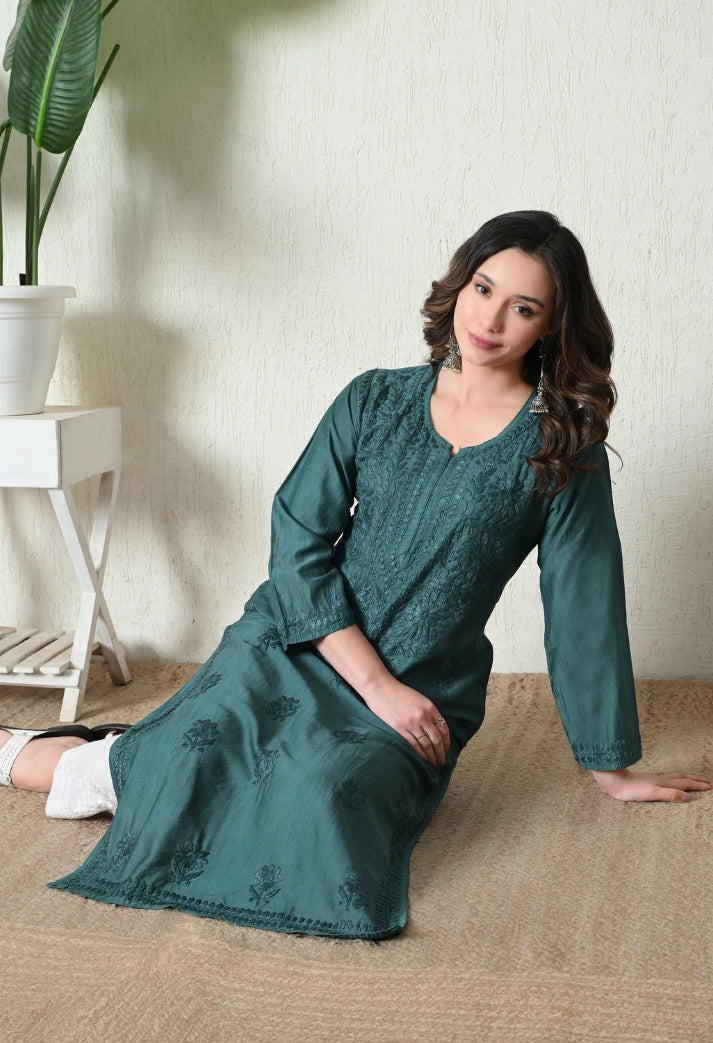 Emerald Teal Chanderi Hand Embroidered Chikankari Kurta