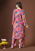 The straight-fit kurta features heavy embroidery on the neckline and sleeves, paired with coordinated palazzos for a refined ethnic look.