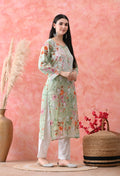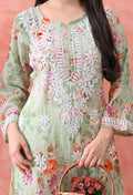 Floral Print Mulmul Pure Cotton Lucknow Chikankari Kurta - Green & White