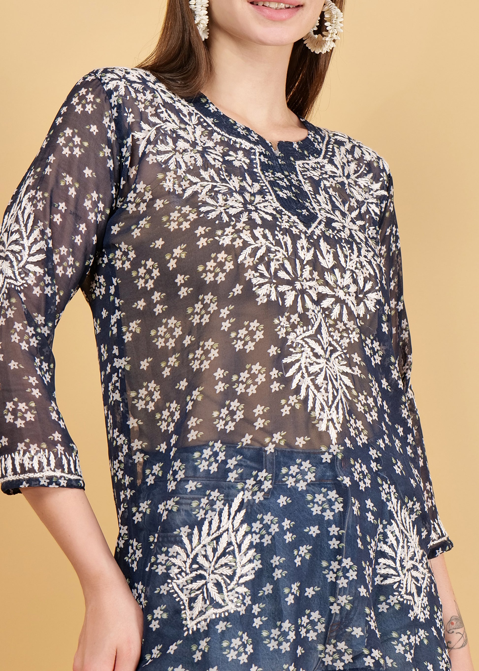 Hand Embroided Lucknow Chikankar Short Straight Georgette Kurta