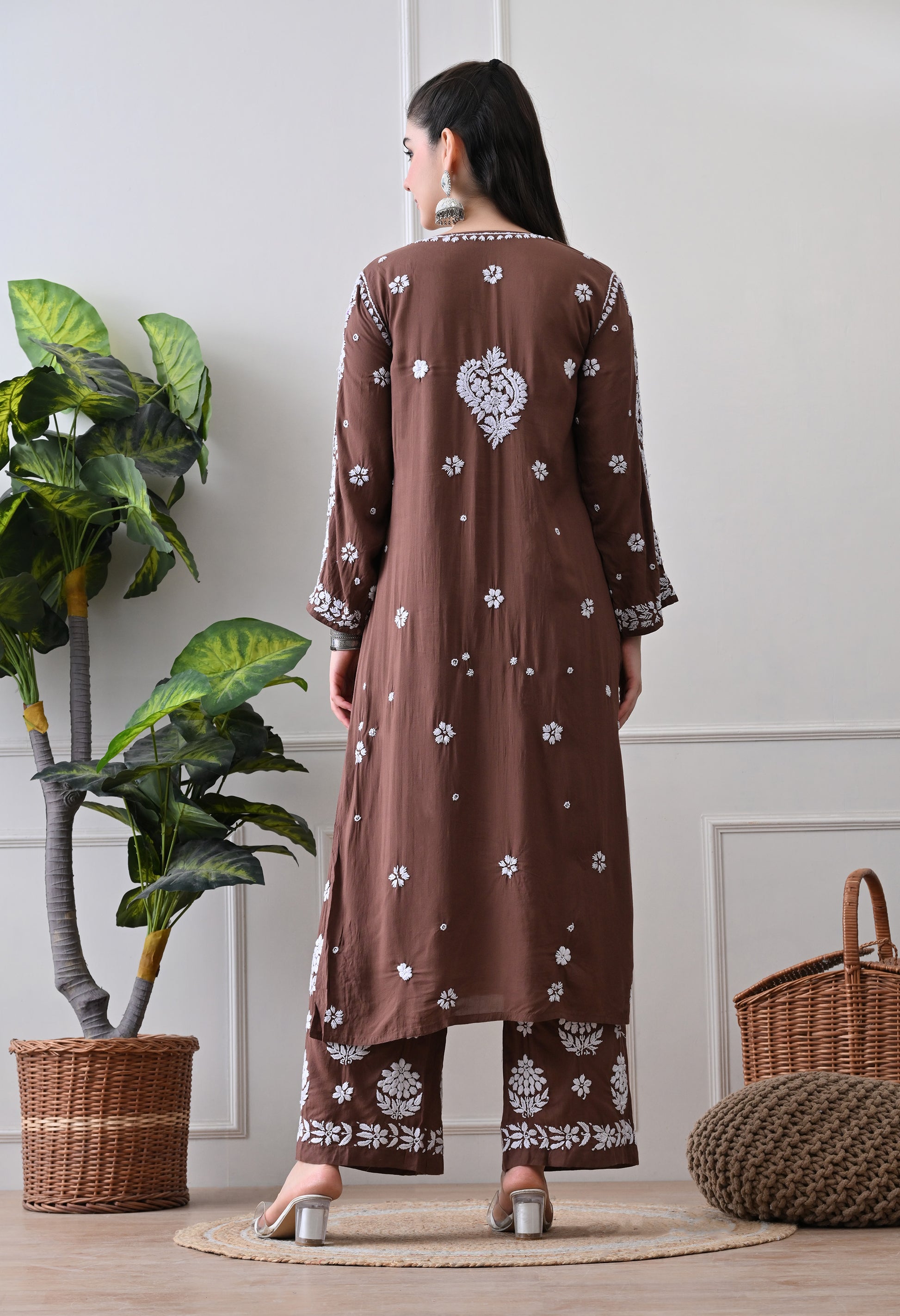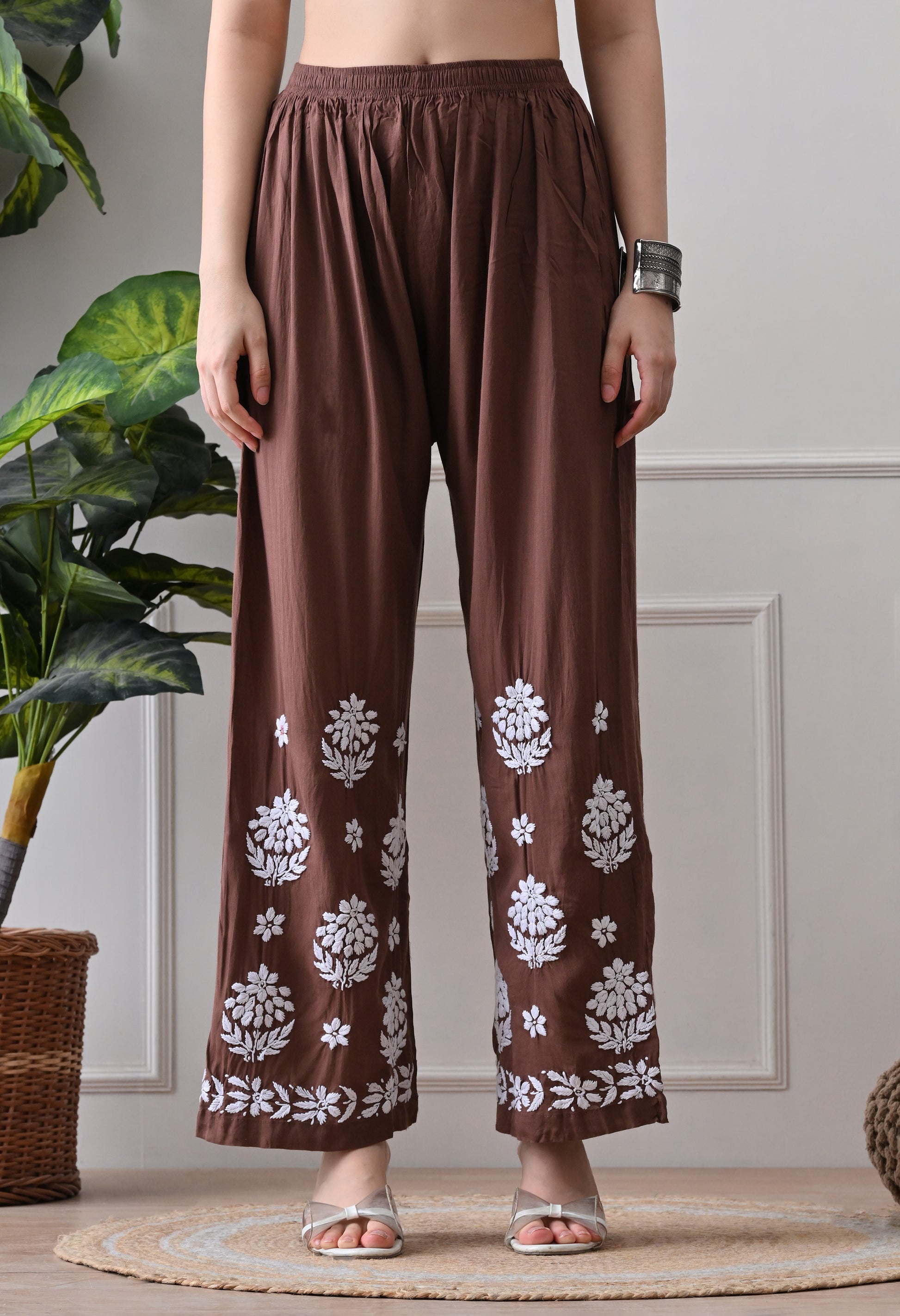 Hand Embroidered Chikankari Modal Plazo Set with 3D Floral Work – Ethnic Wear for Women – Brown