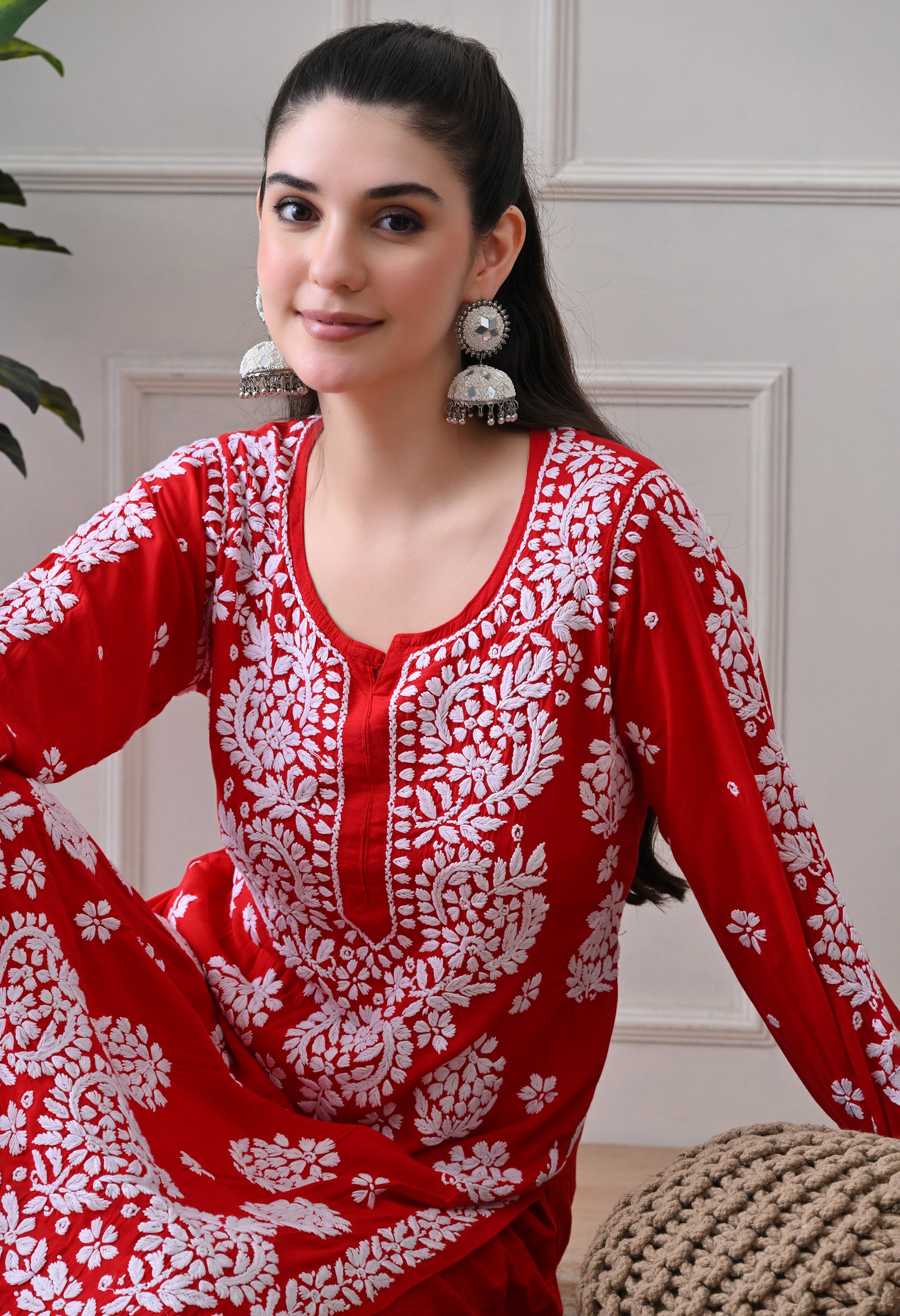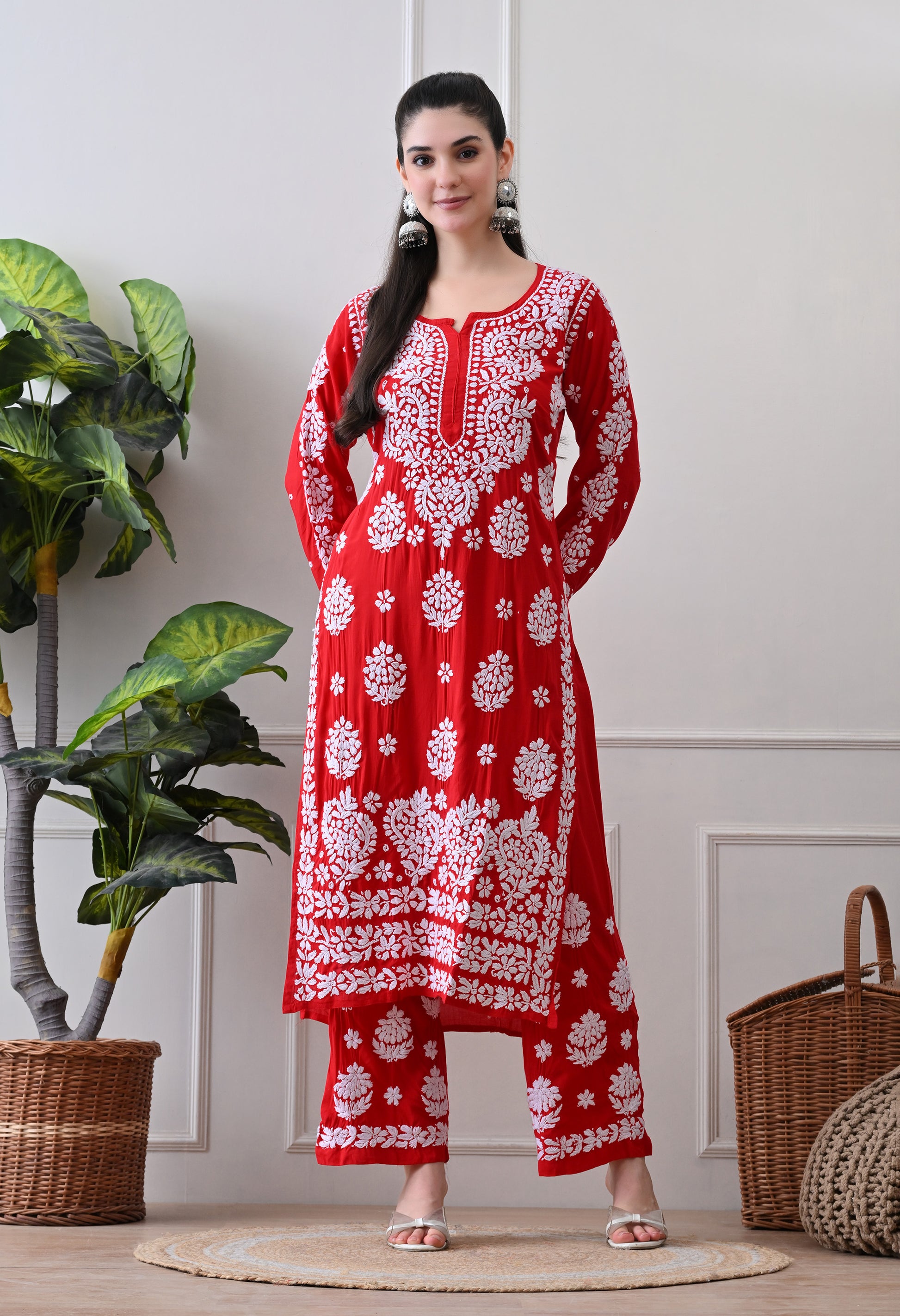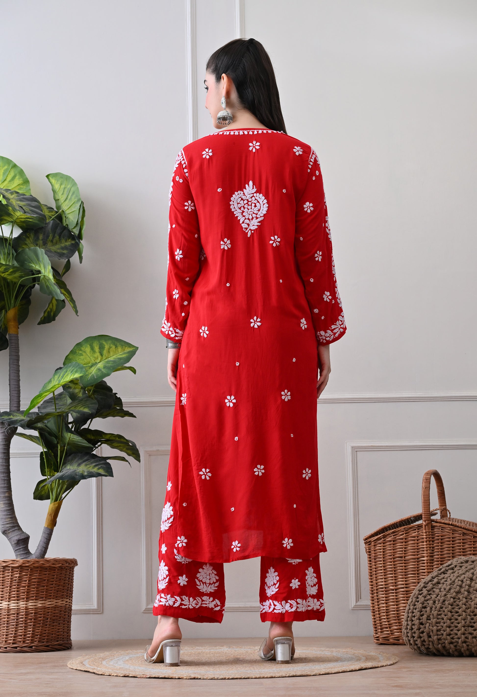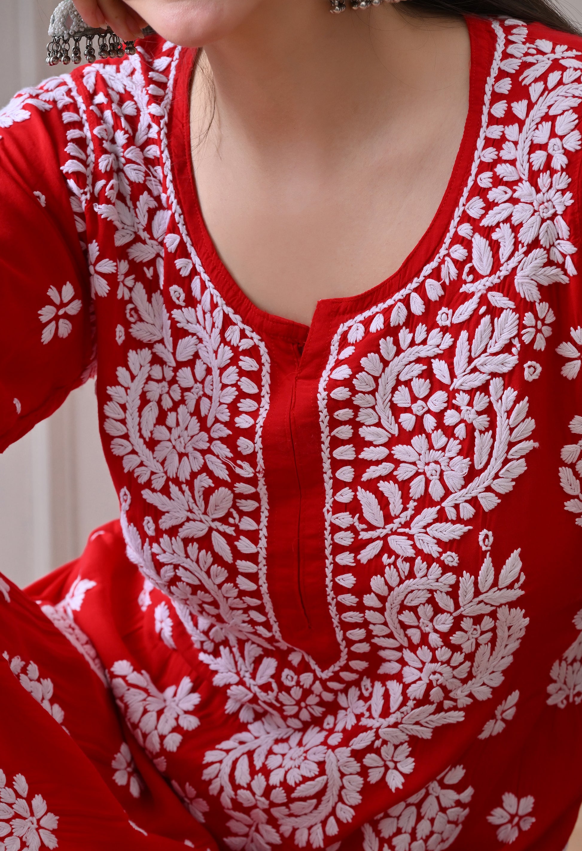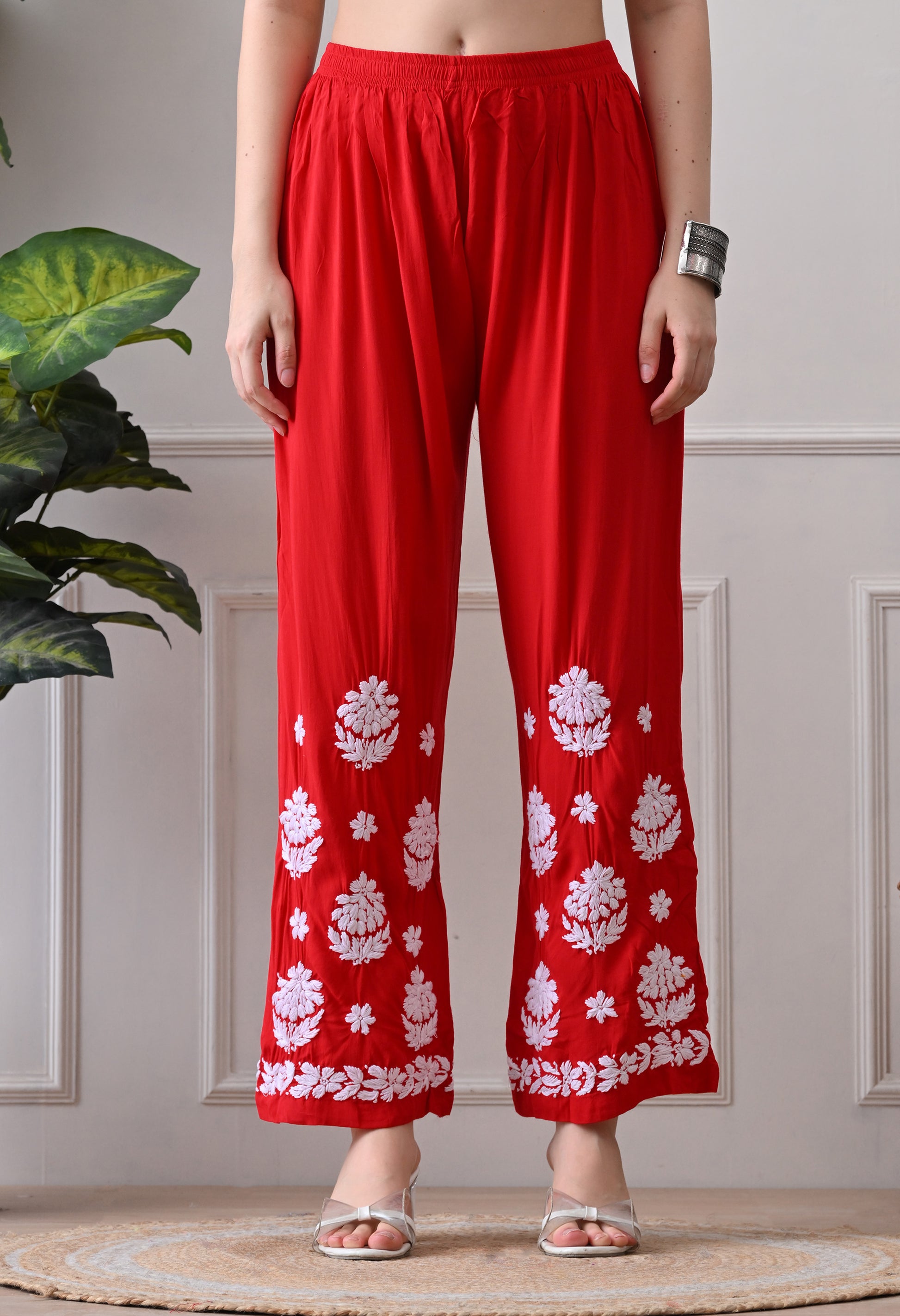 Hand Embroidered Chikankari Modal Plazo Set with 3D Floral Work Red