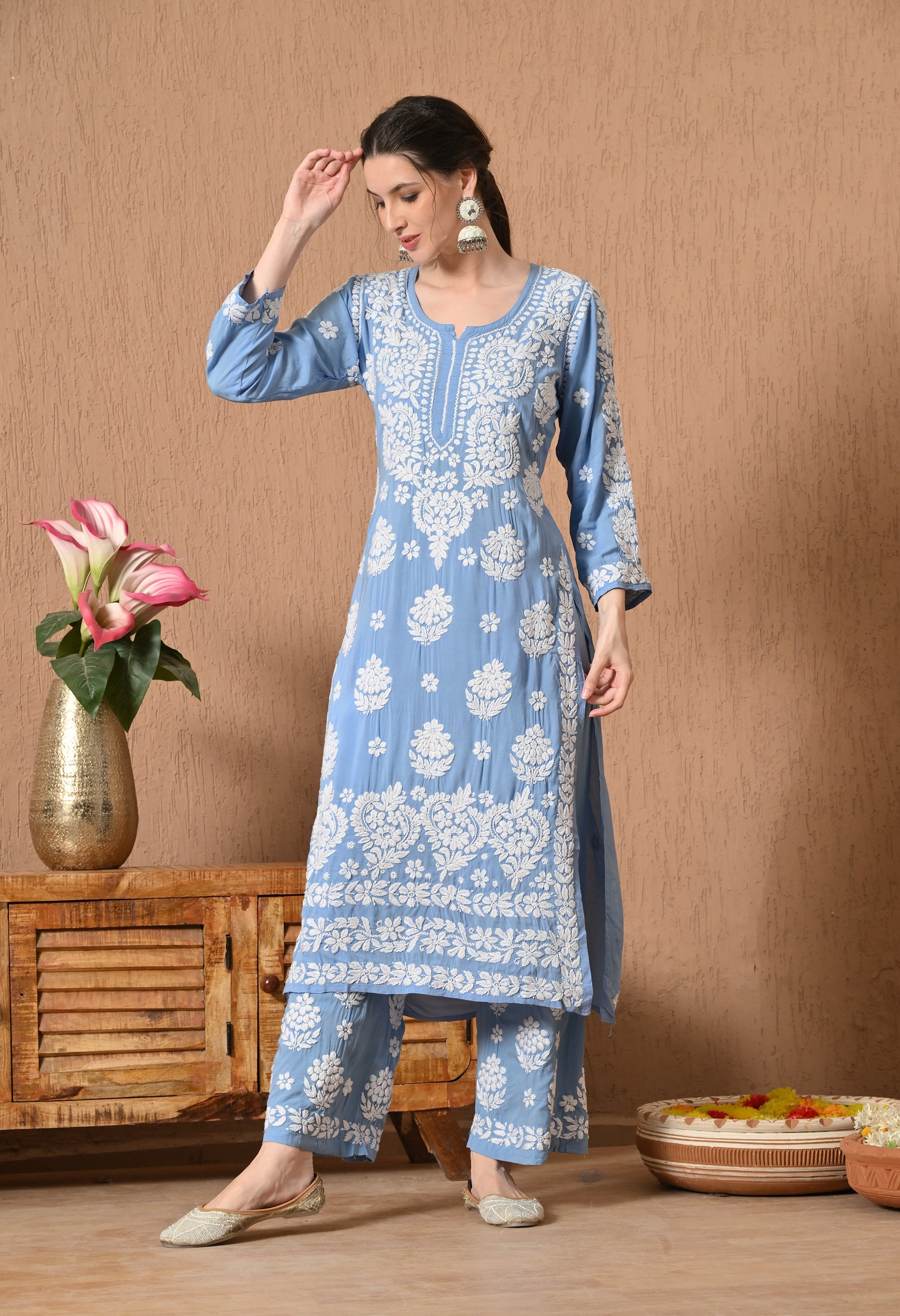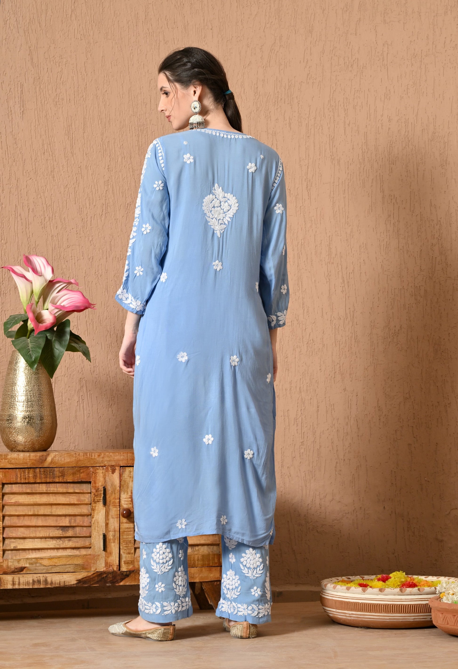 Hand Embroidered Chikankari Modal Plazo Set with 3D Work – Ethnic Wear Powder Blue