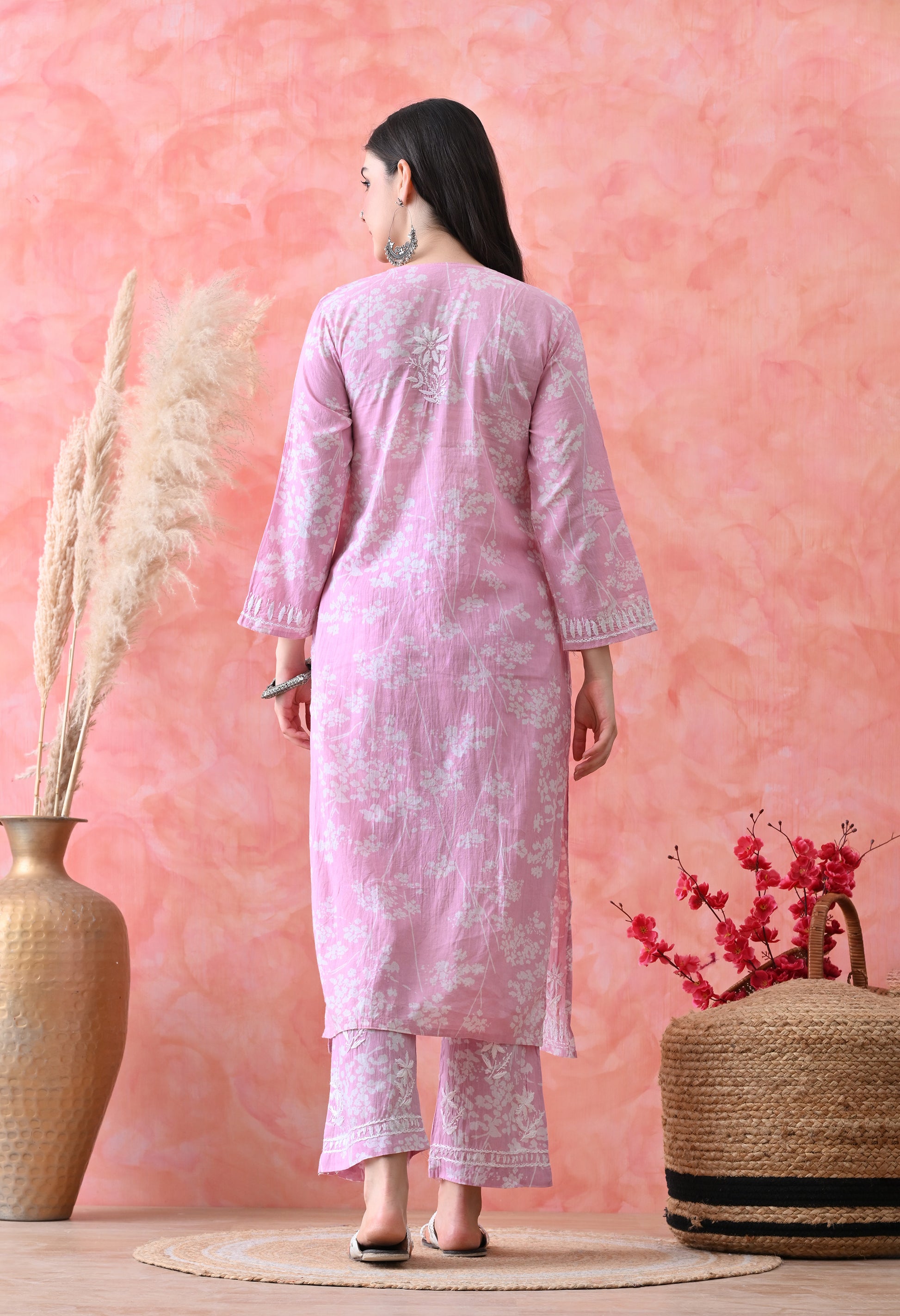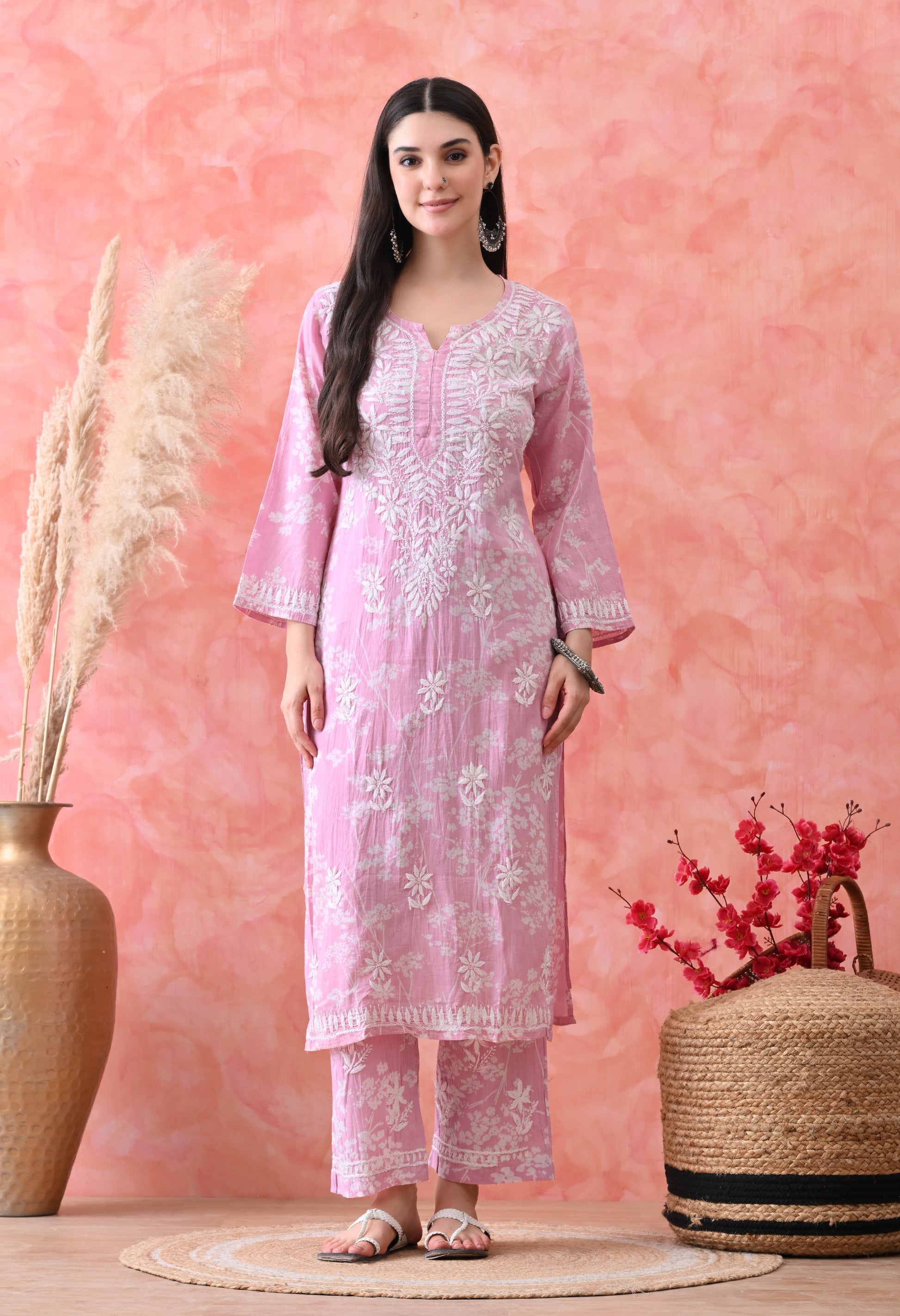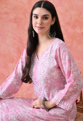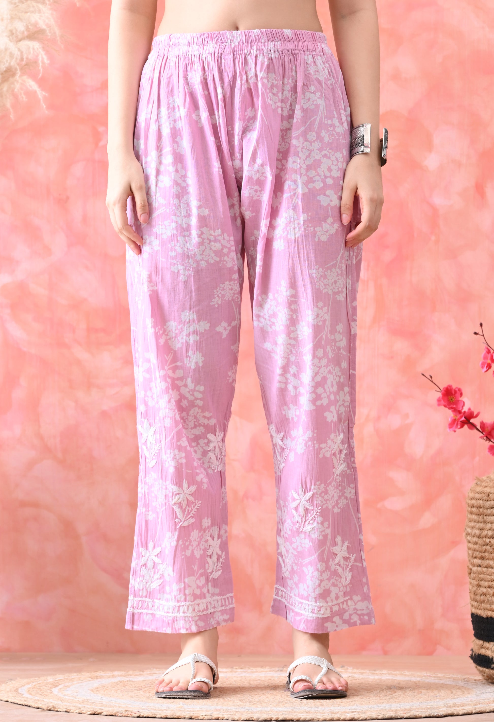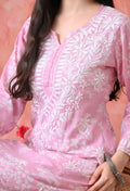 Hand Embroidered Chikankari Mulmul Palazzo Set – Pink & White