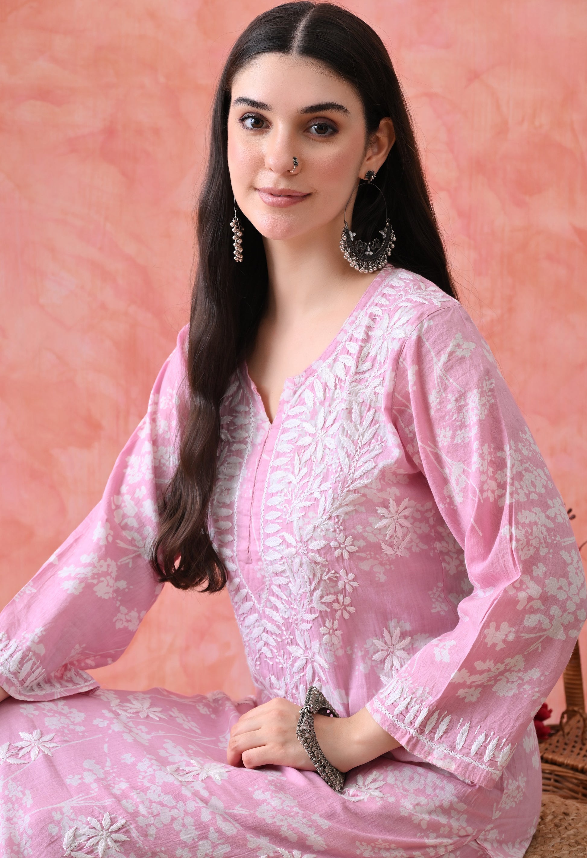 - Pink & white embroidered kurta with trousers