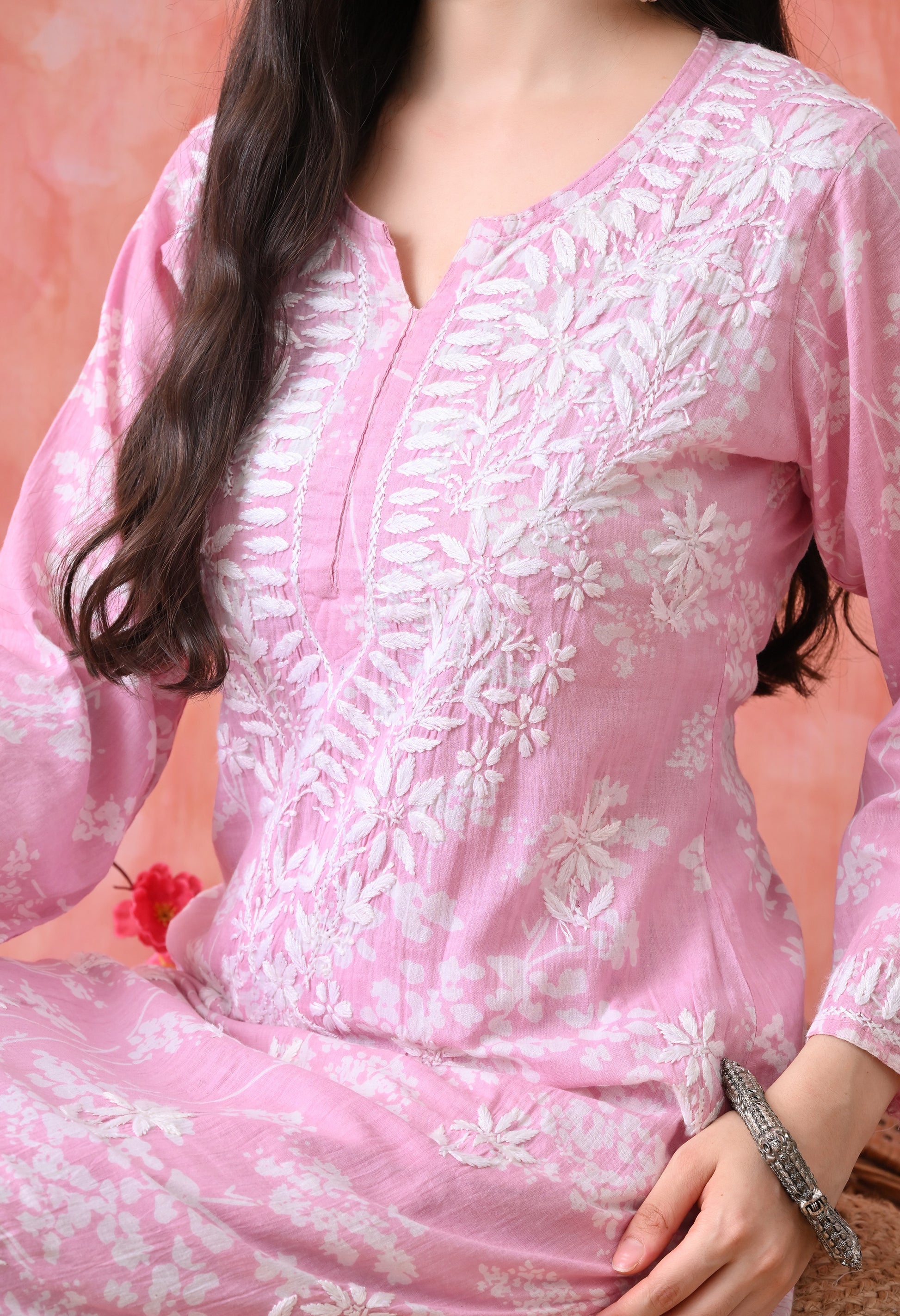 - Floral hand-embroidered chikankari motifs