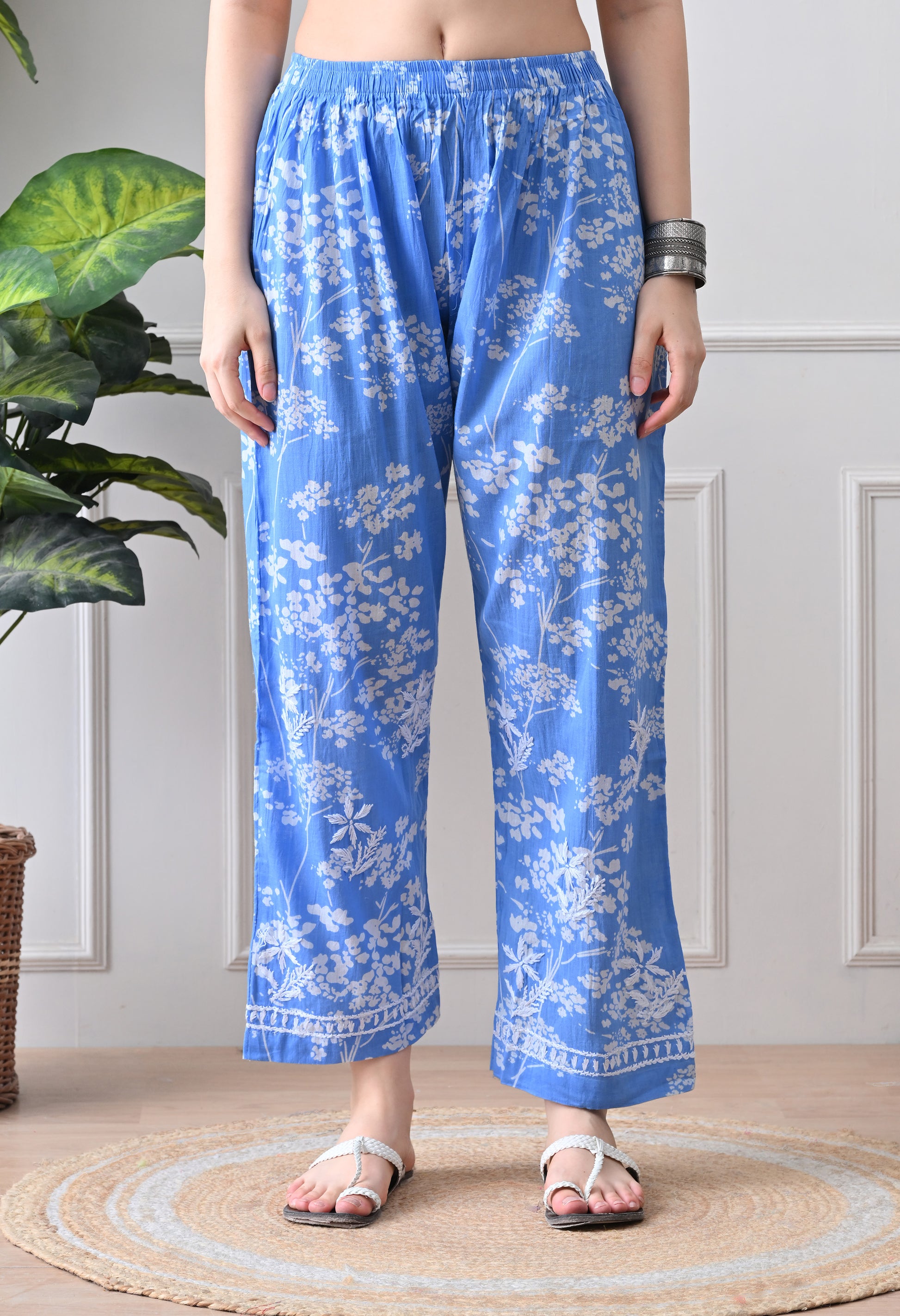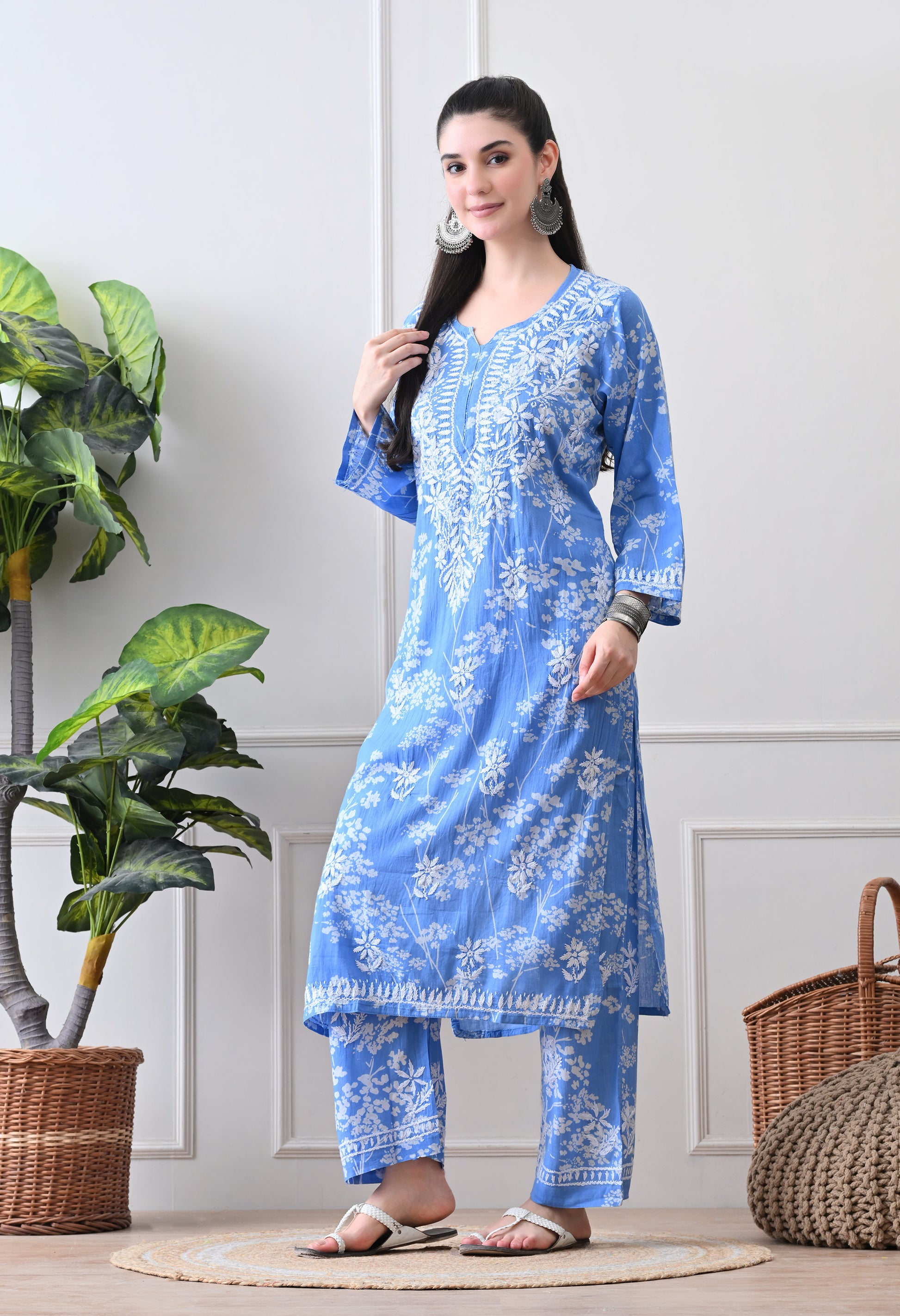 Hand Embroidered Chikankari Mulmul Plazo Set – Floral Blue Delight