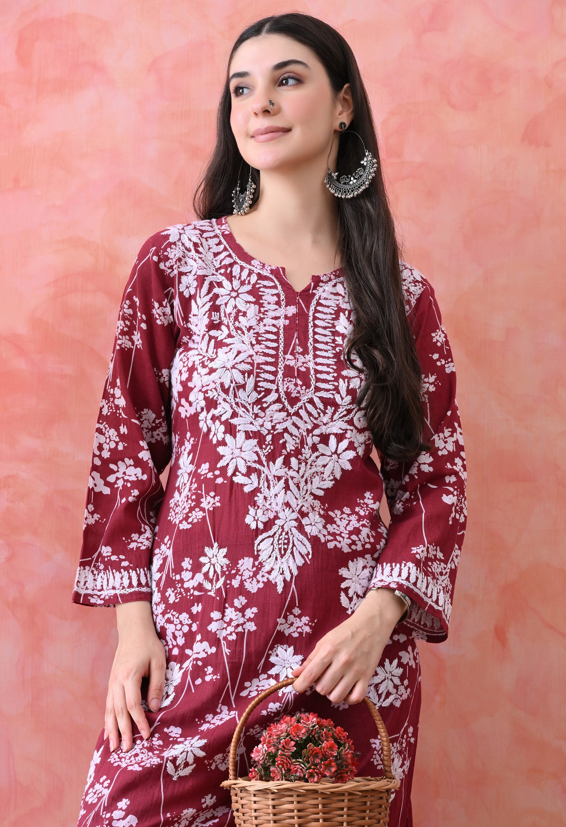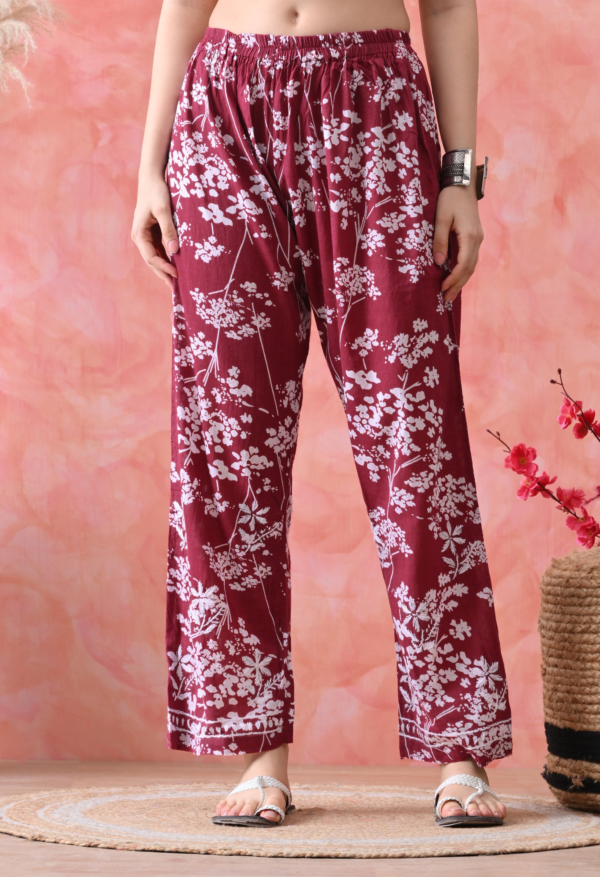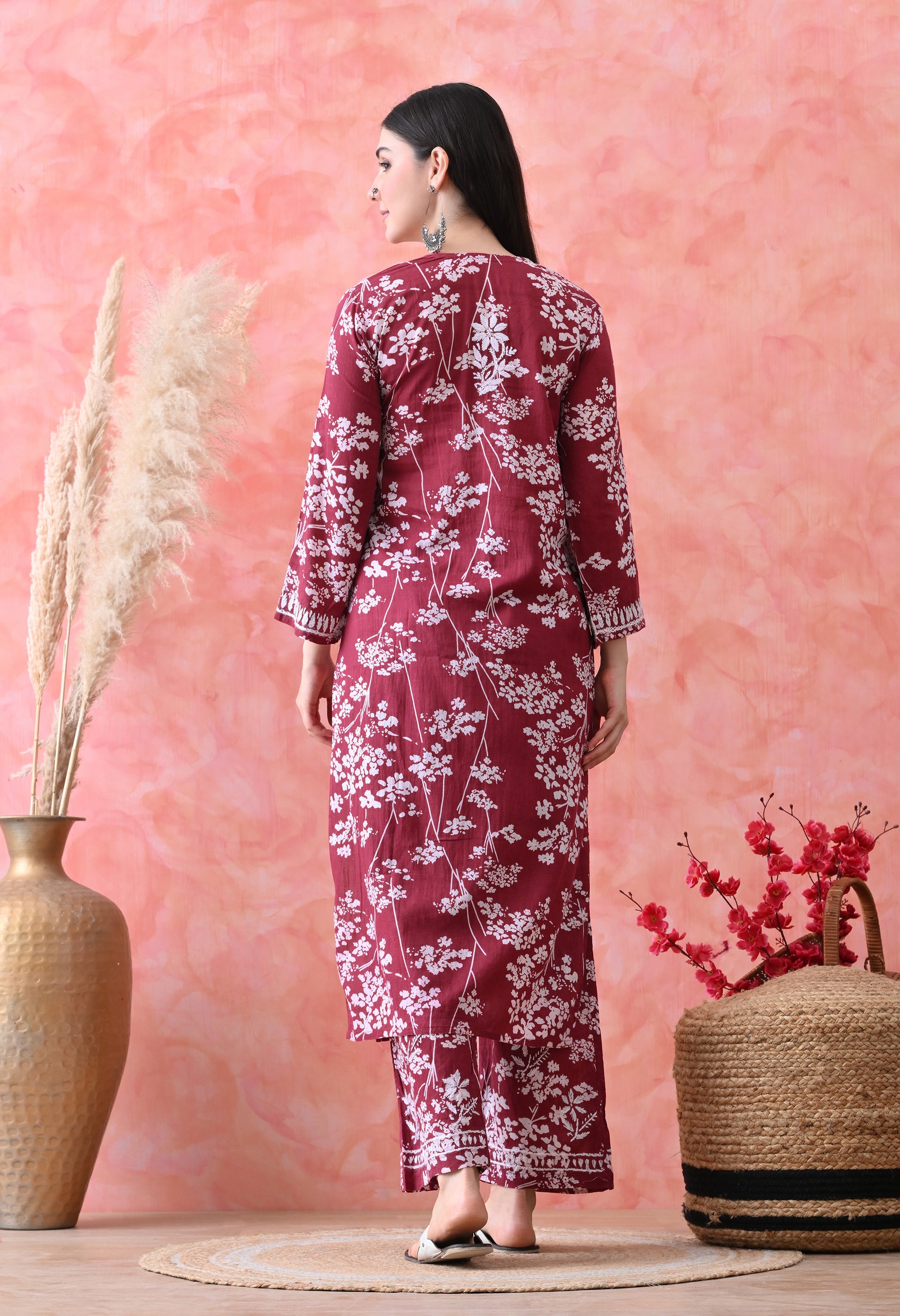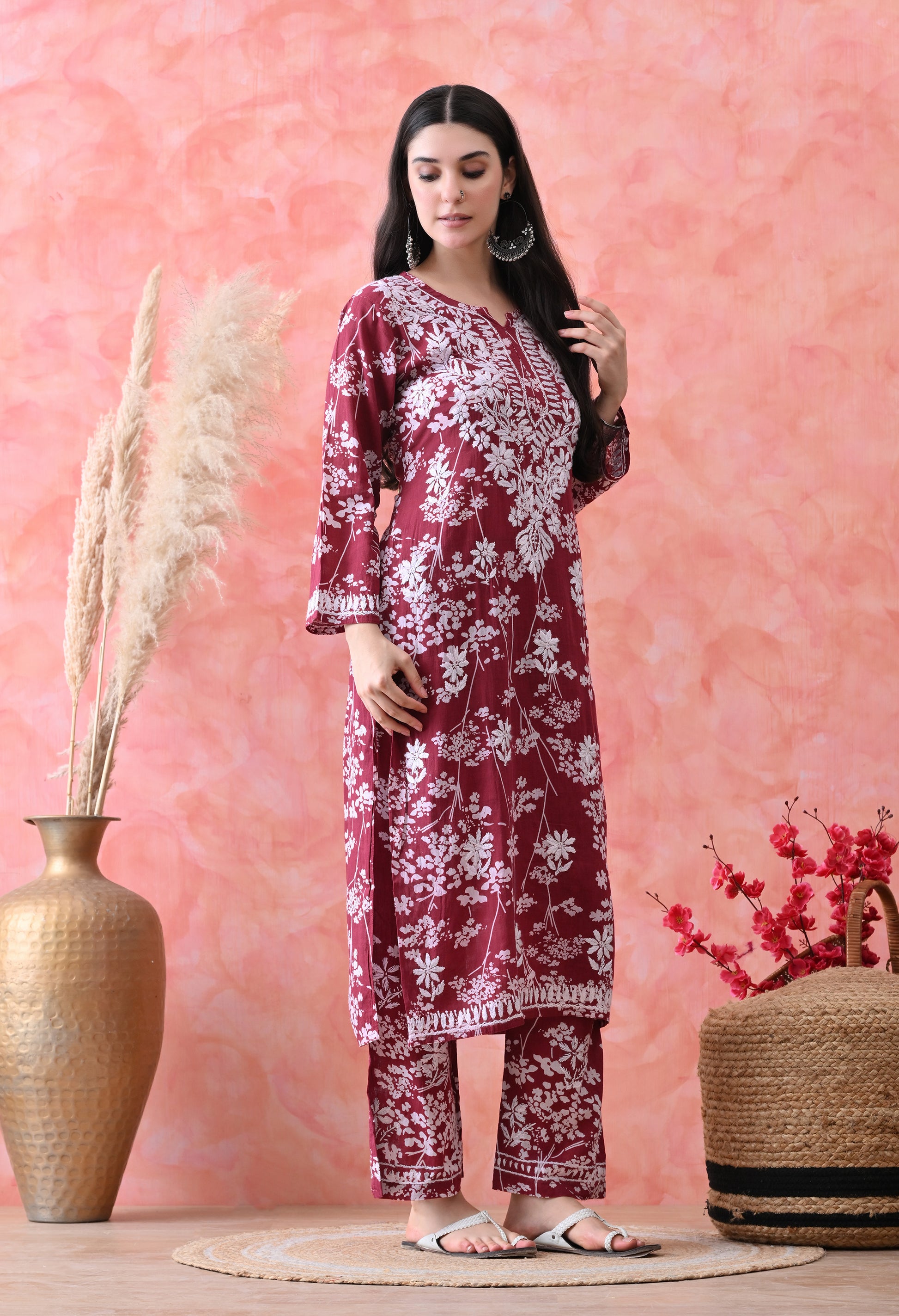 Hand Embroidered Chikankari Mulmul Plazo Set – Floral Delight Maroon