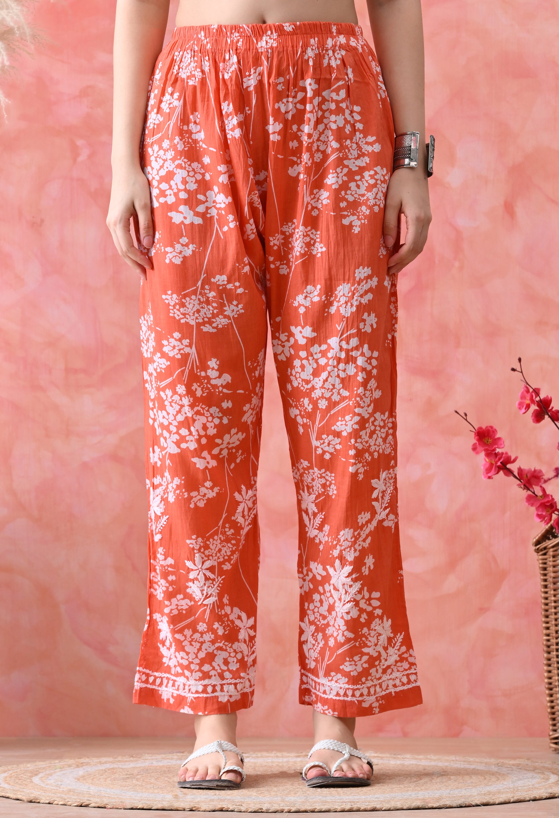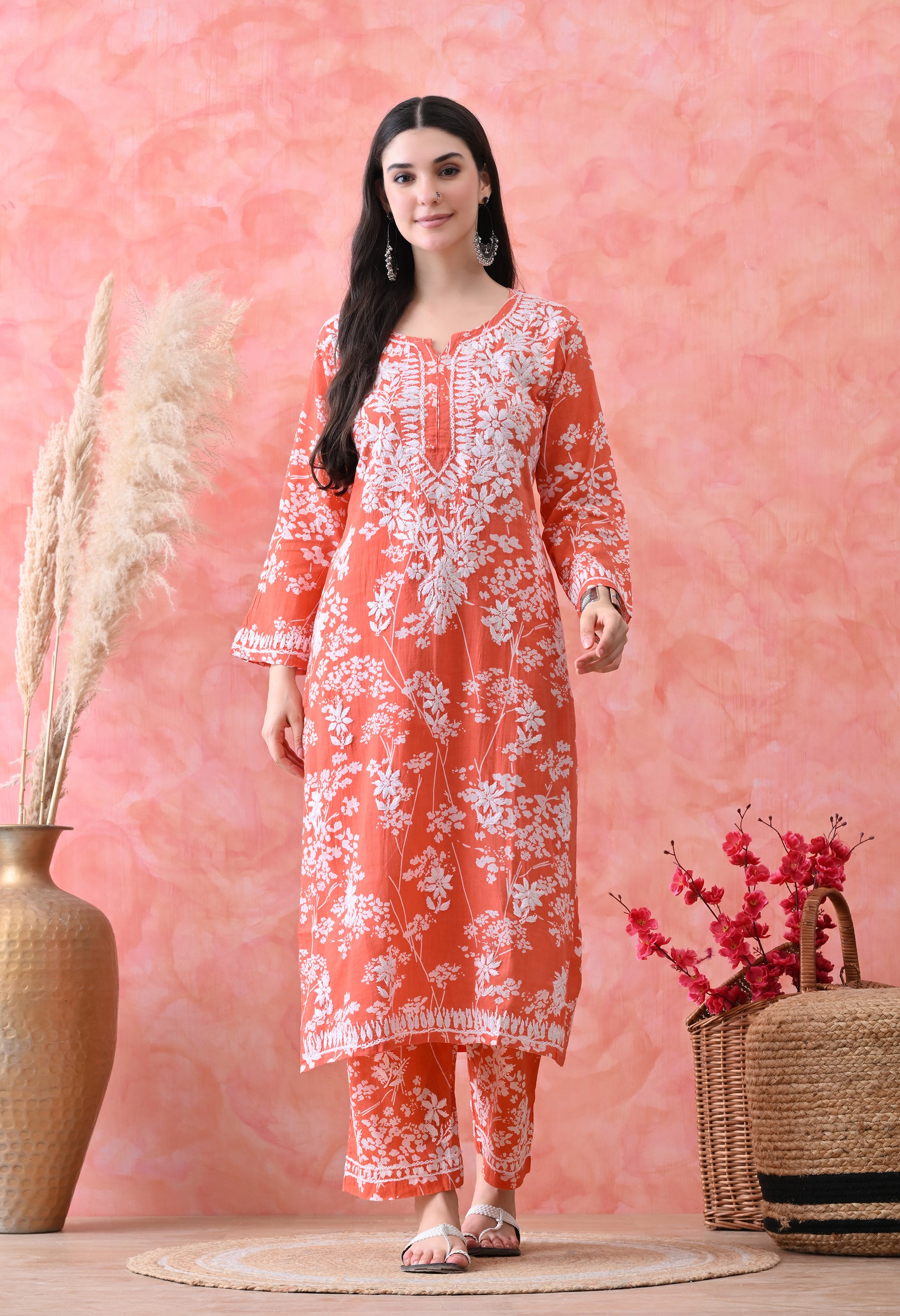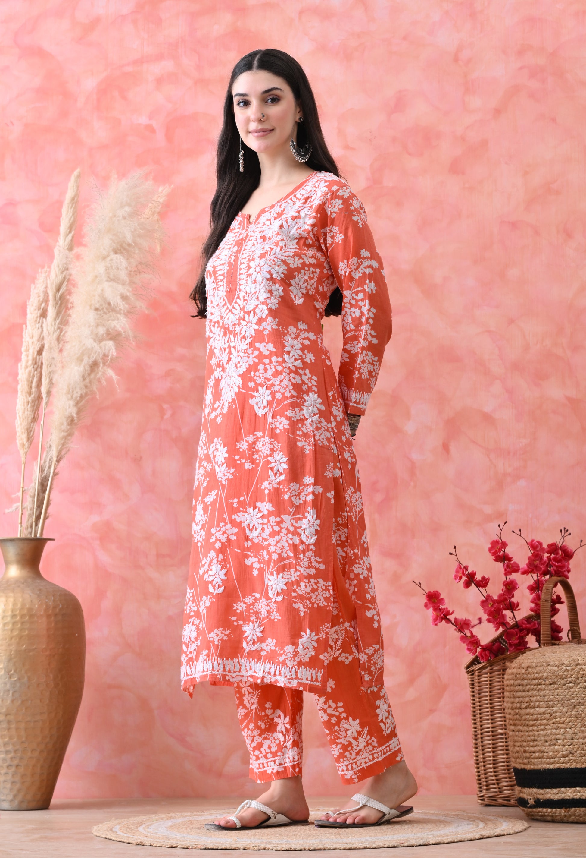 Hand Embroidered Chikankari Mulmul Plazo Set – Floral Delight Orange