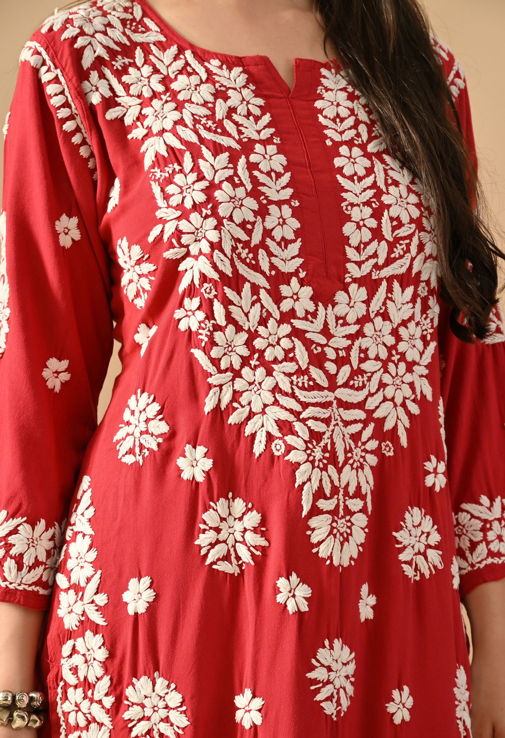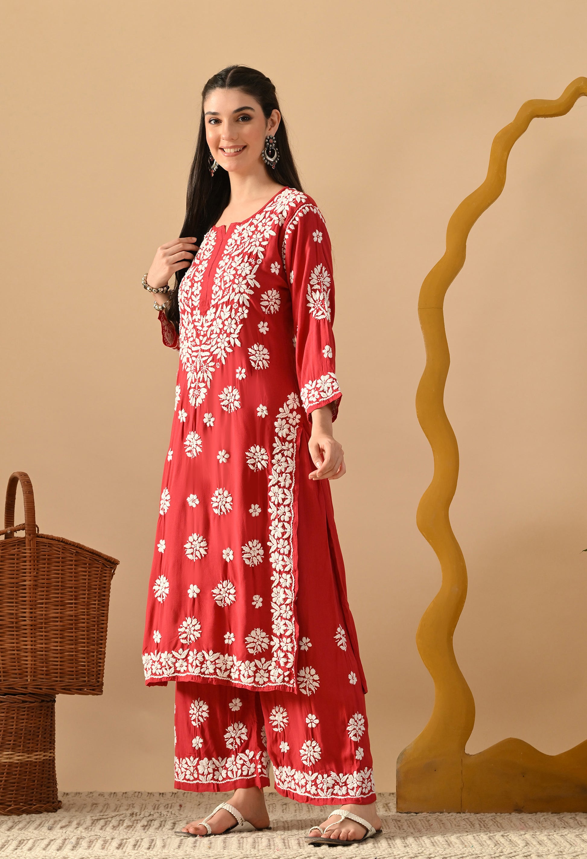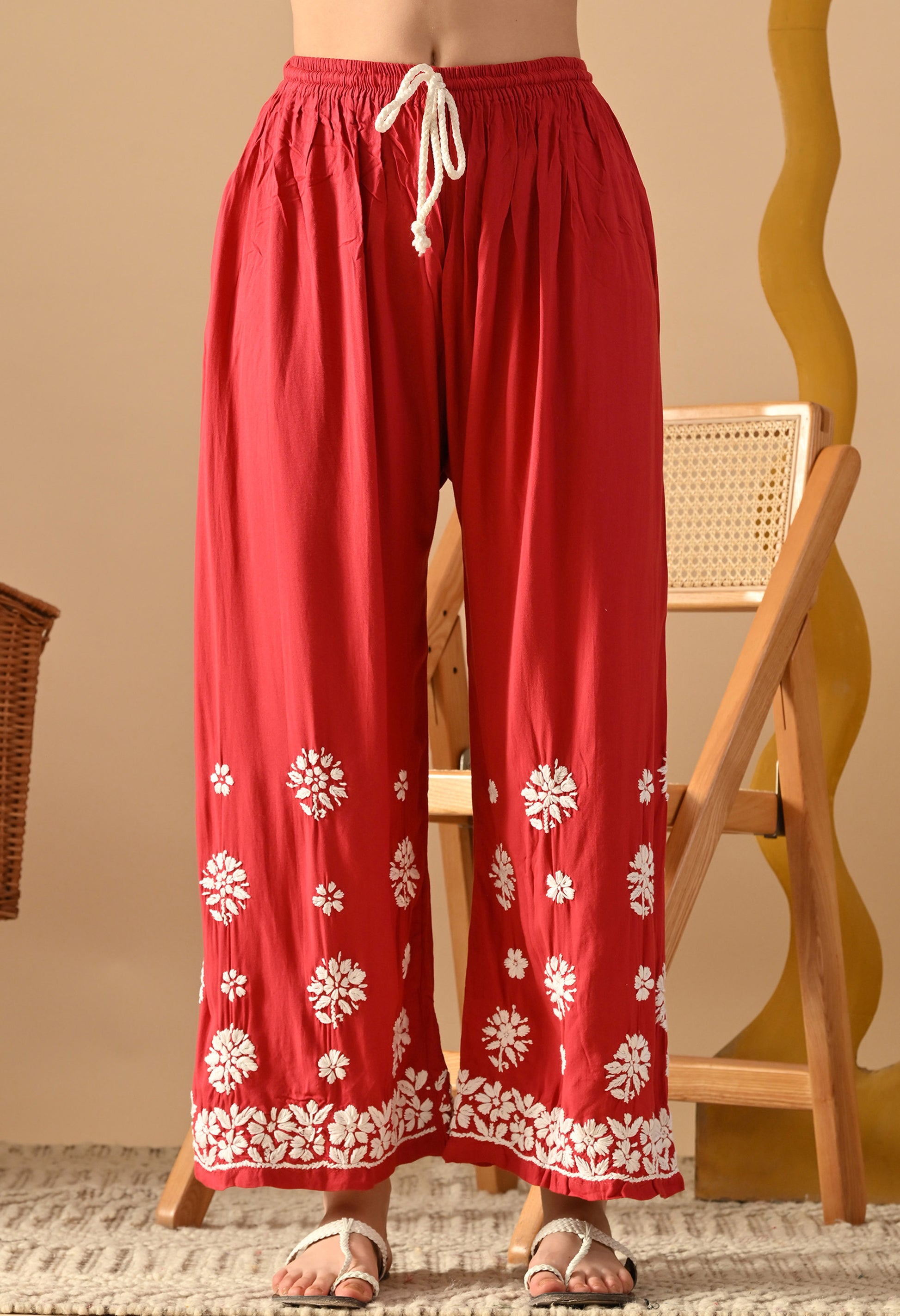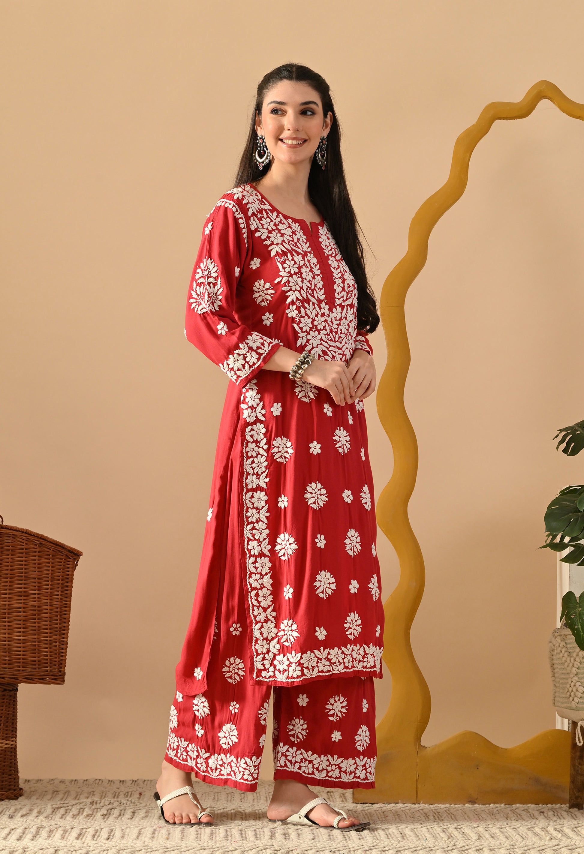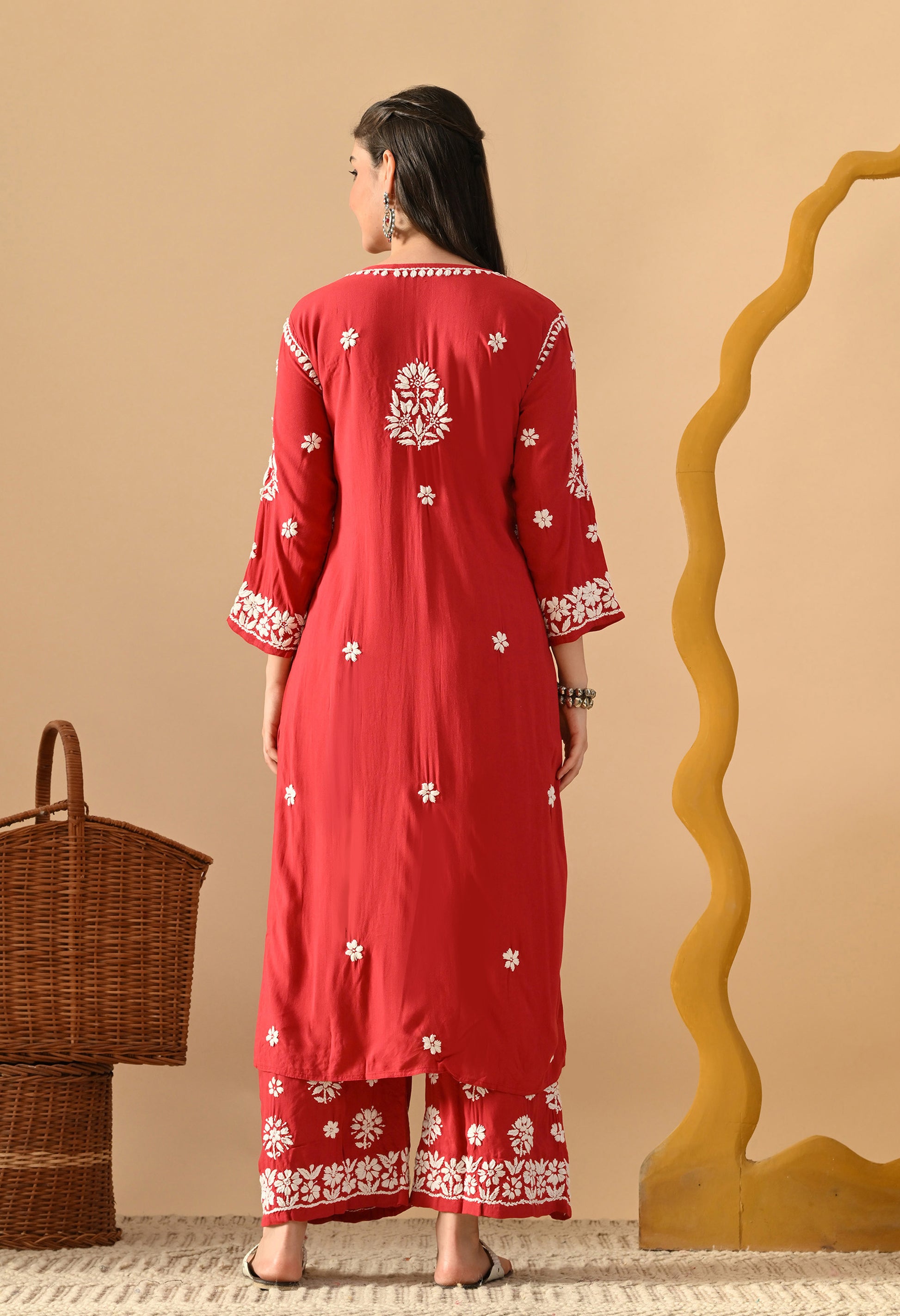 Hand Embroidered Chikankari Plazo Set 3d Work- Cherry Red