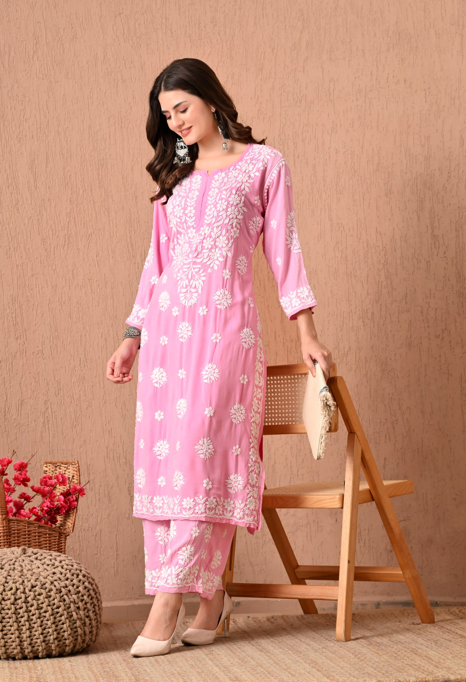 Hand Embroidered Chikankari Plazo Set 3d Work- Pink