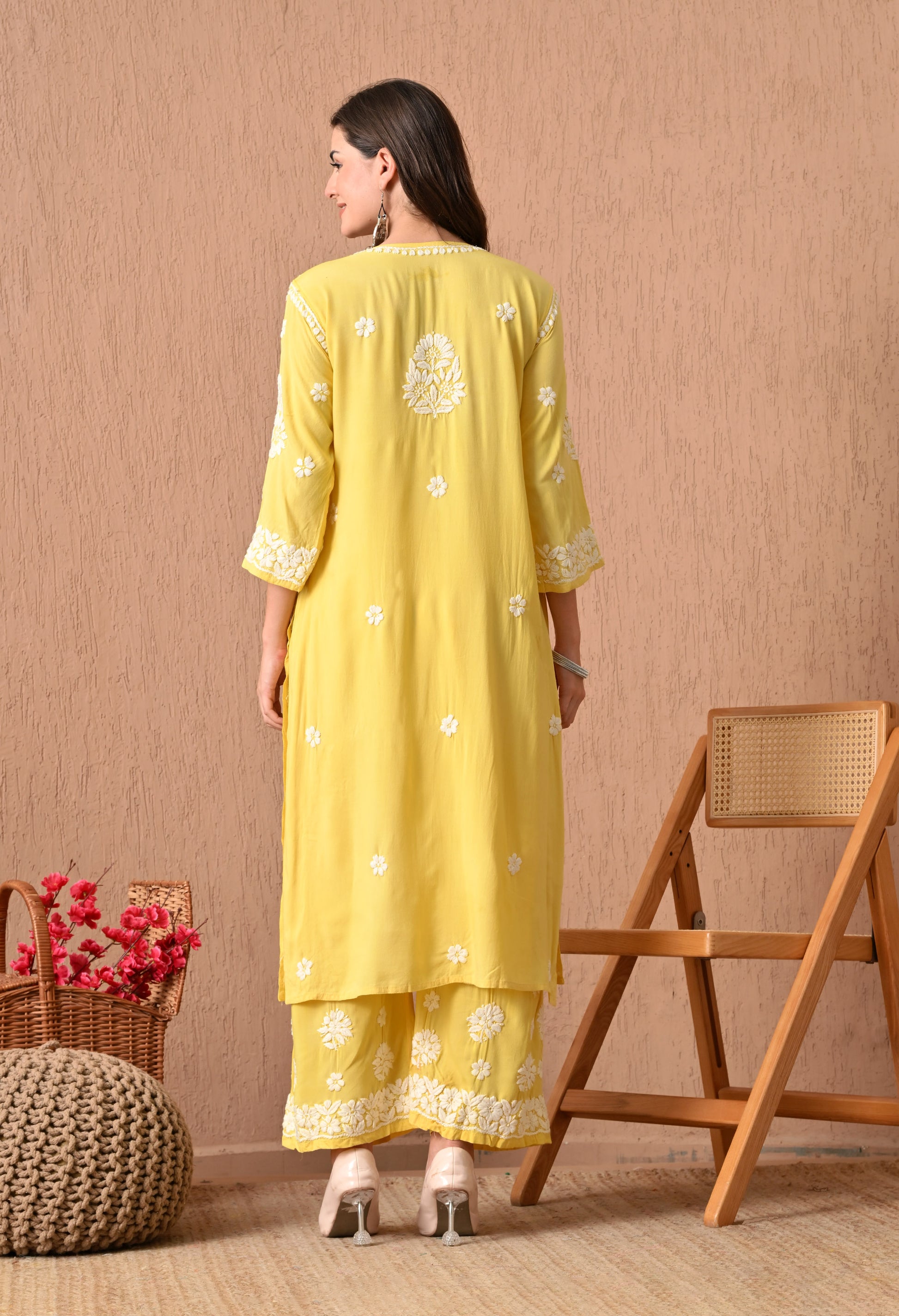 Hand Embroidered Chikankari Plazo Set 3d Work- Yellow