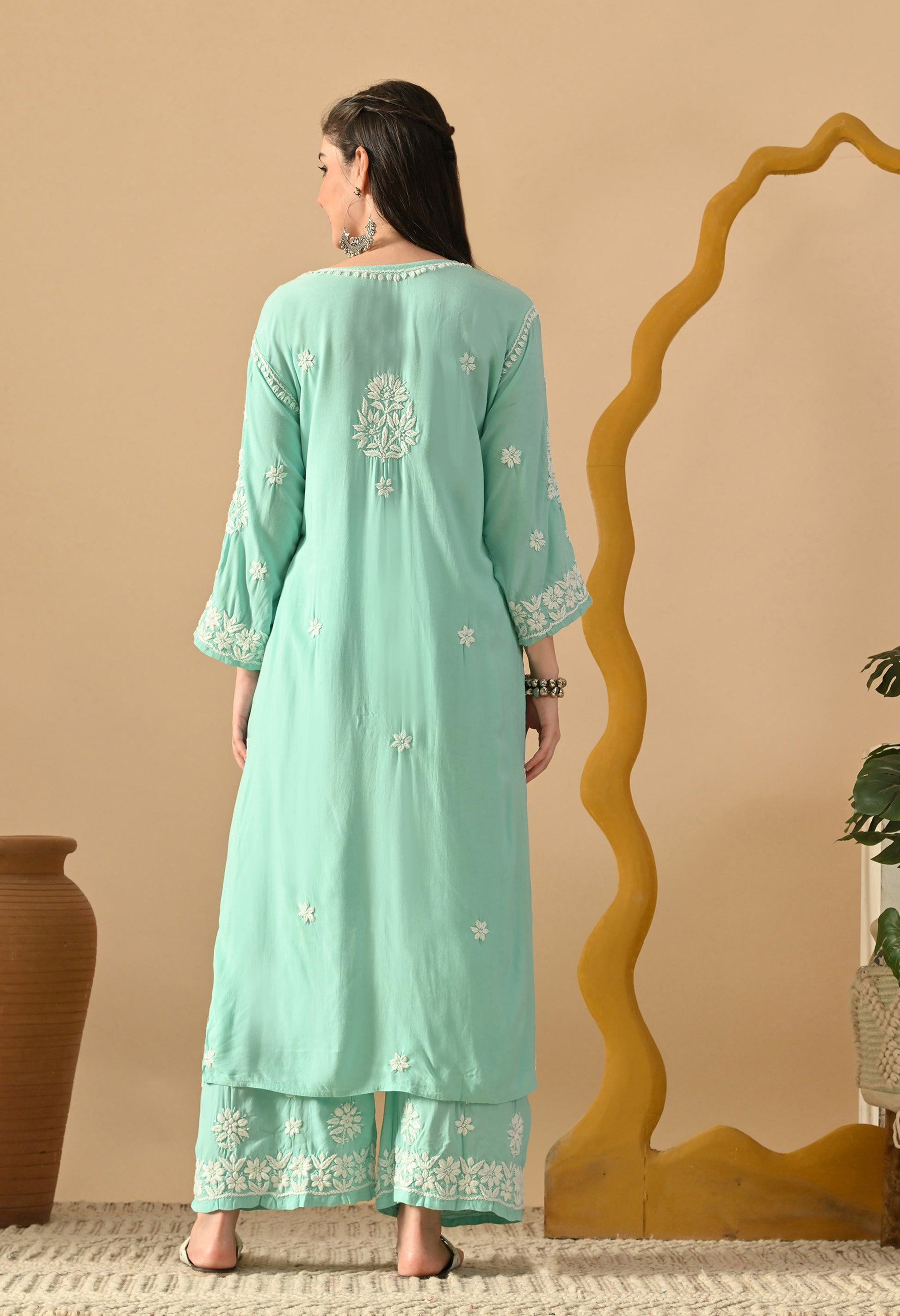 Hand Embroidered Chikankari Rayon Plazo Set 3d Work- Bottle Green