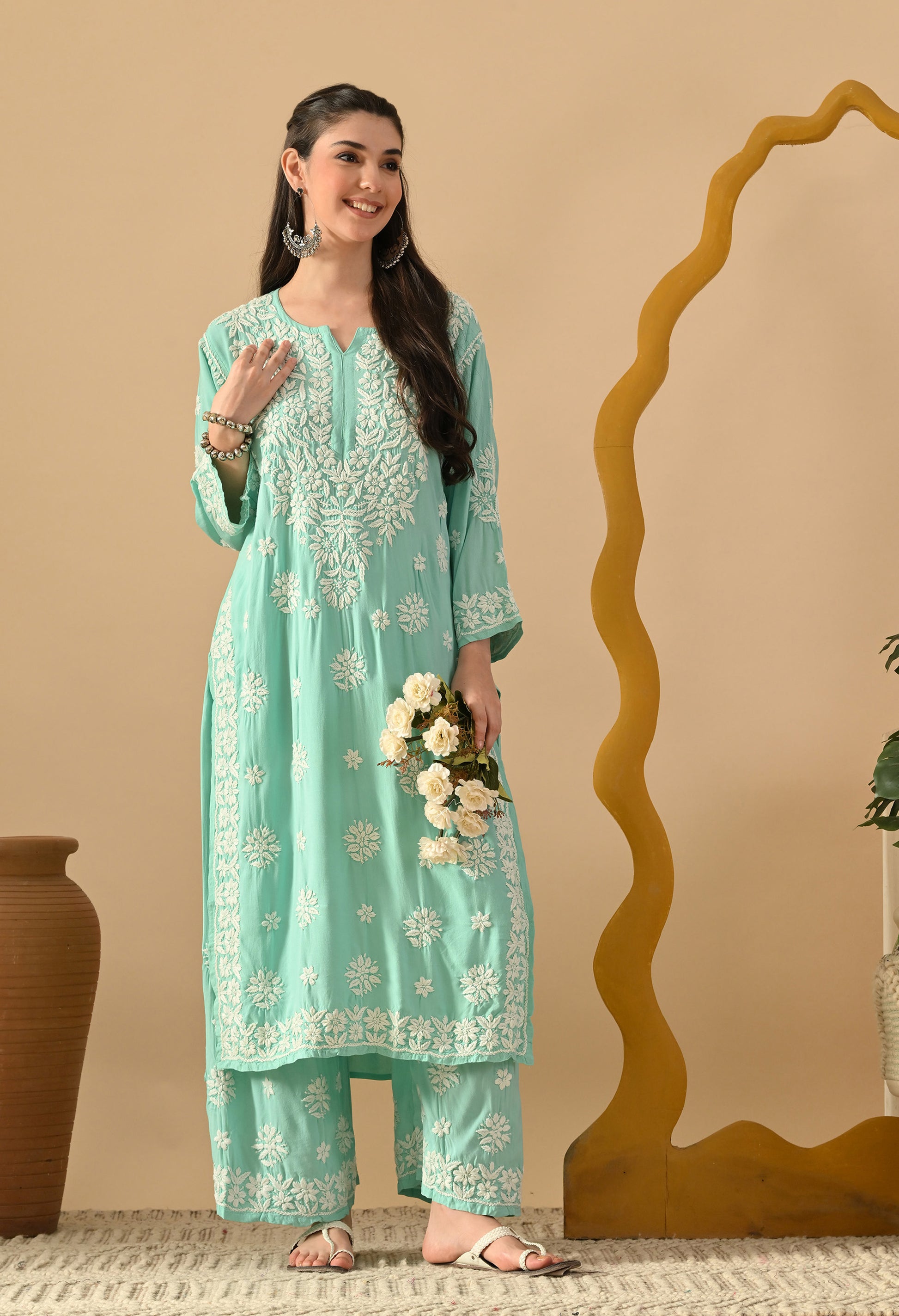 Overall, a Cotton Plazo set made up of Handmade Chikankari work is a timeless ensemble that combines traditional craftsmanship with contemporary style, making it a popular choice among fashion enthusiasts.