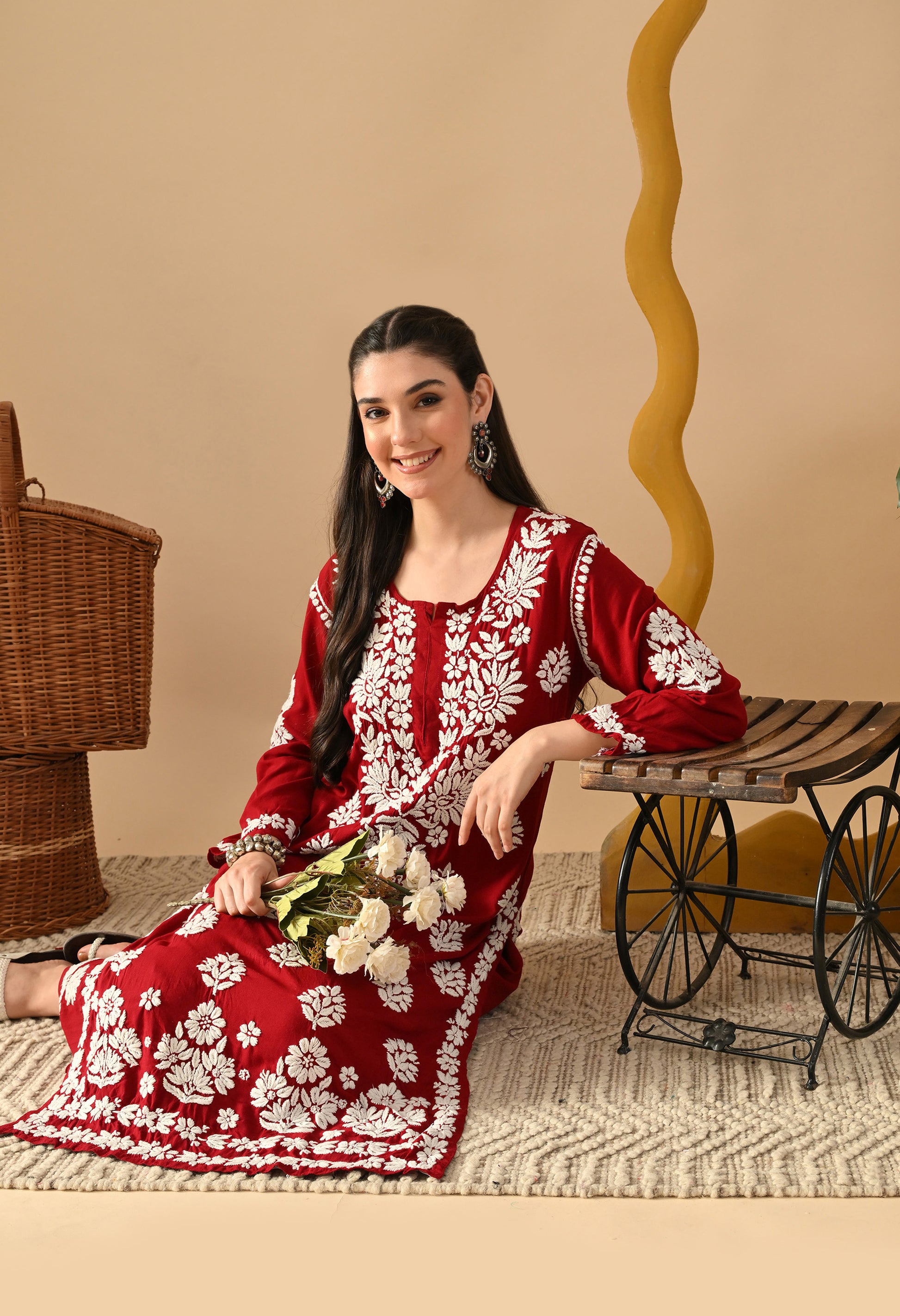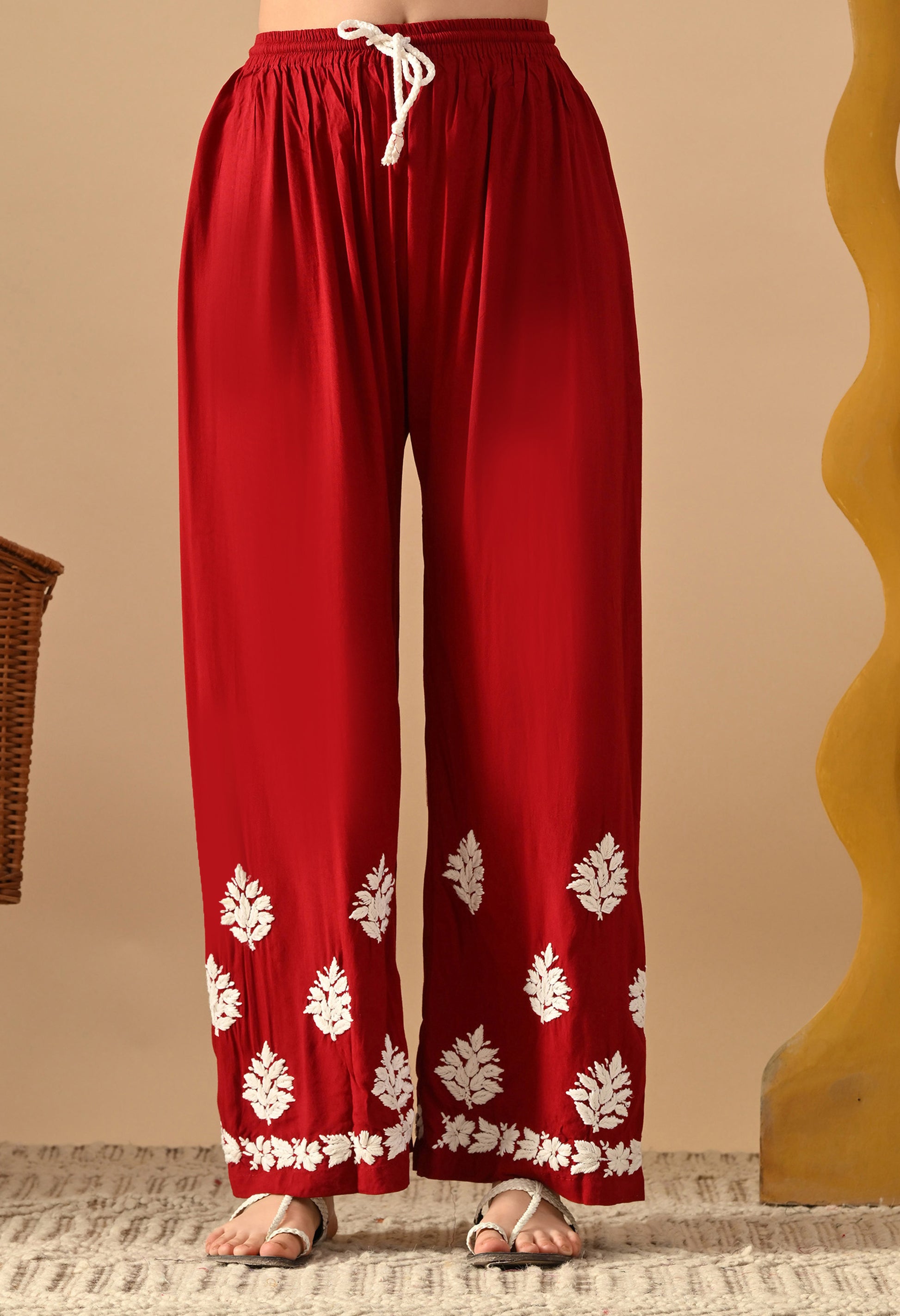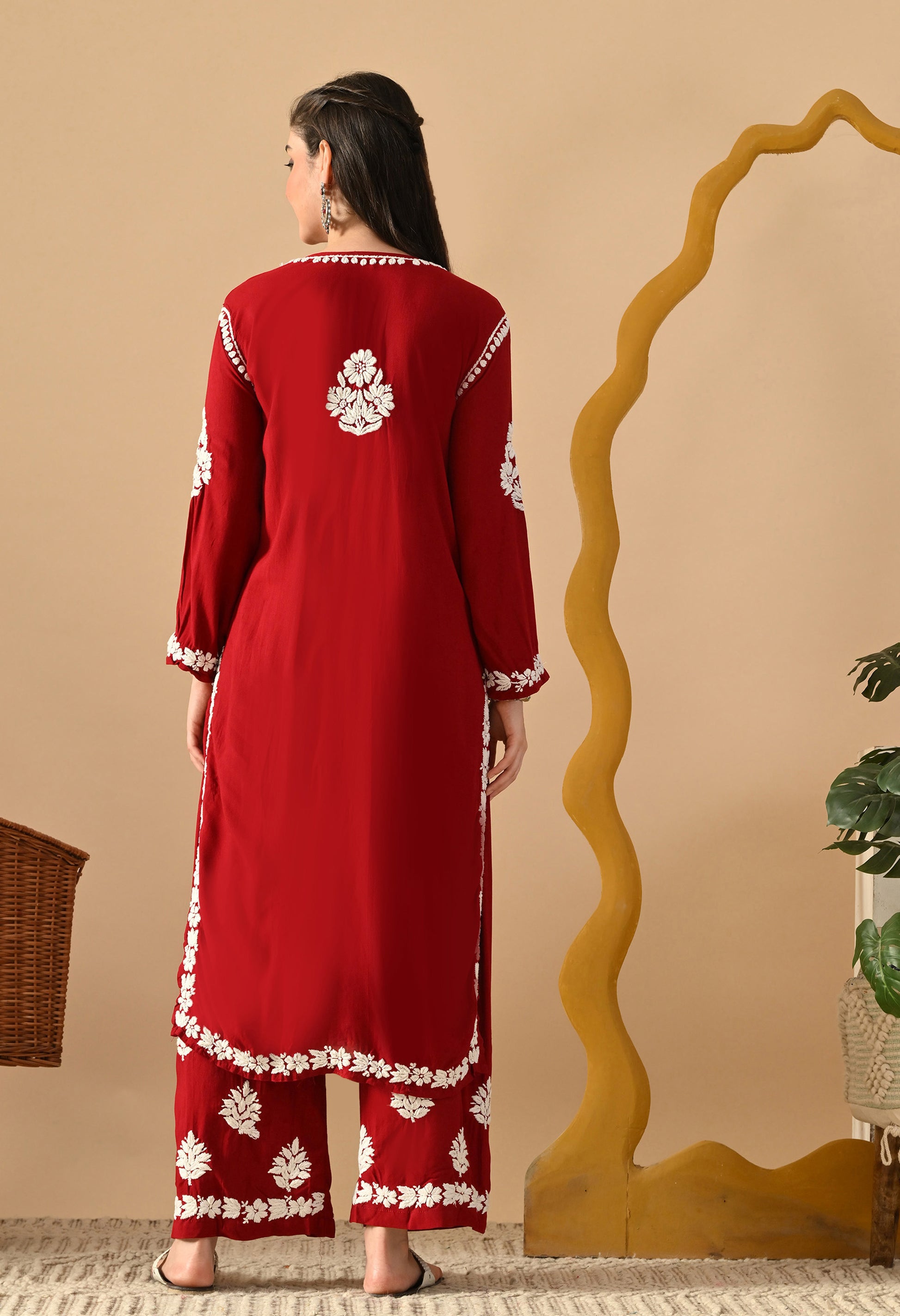 Hand Embroidered Chikankari Rayon Plazo Set 3d Work- Maroon