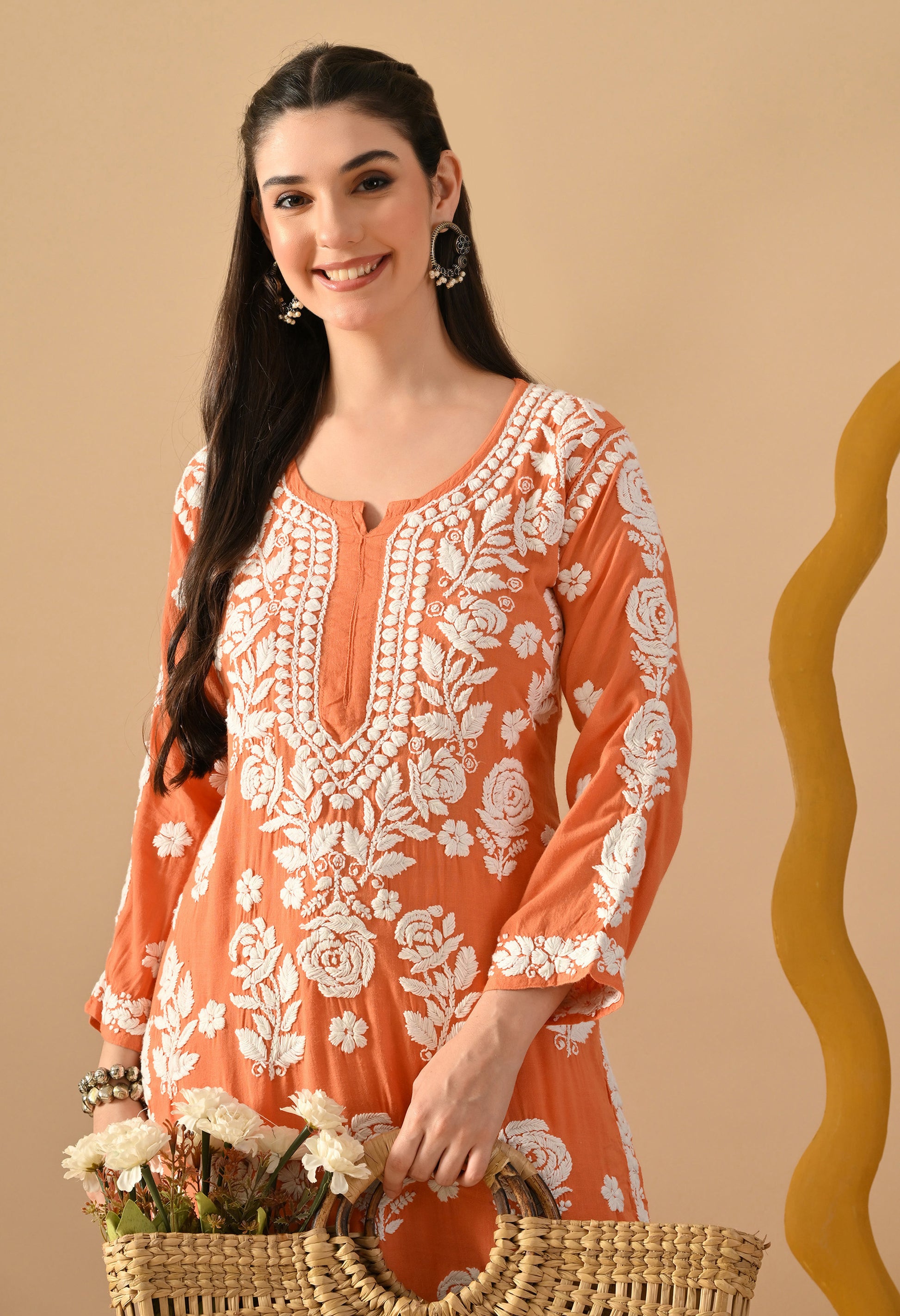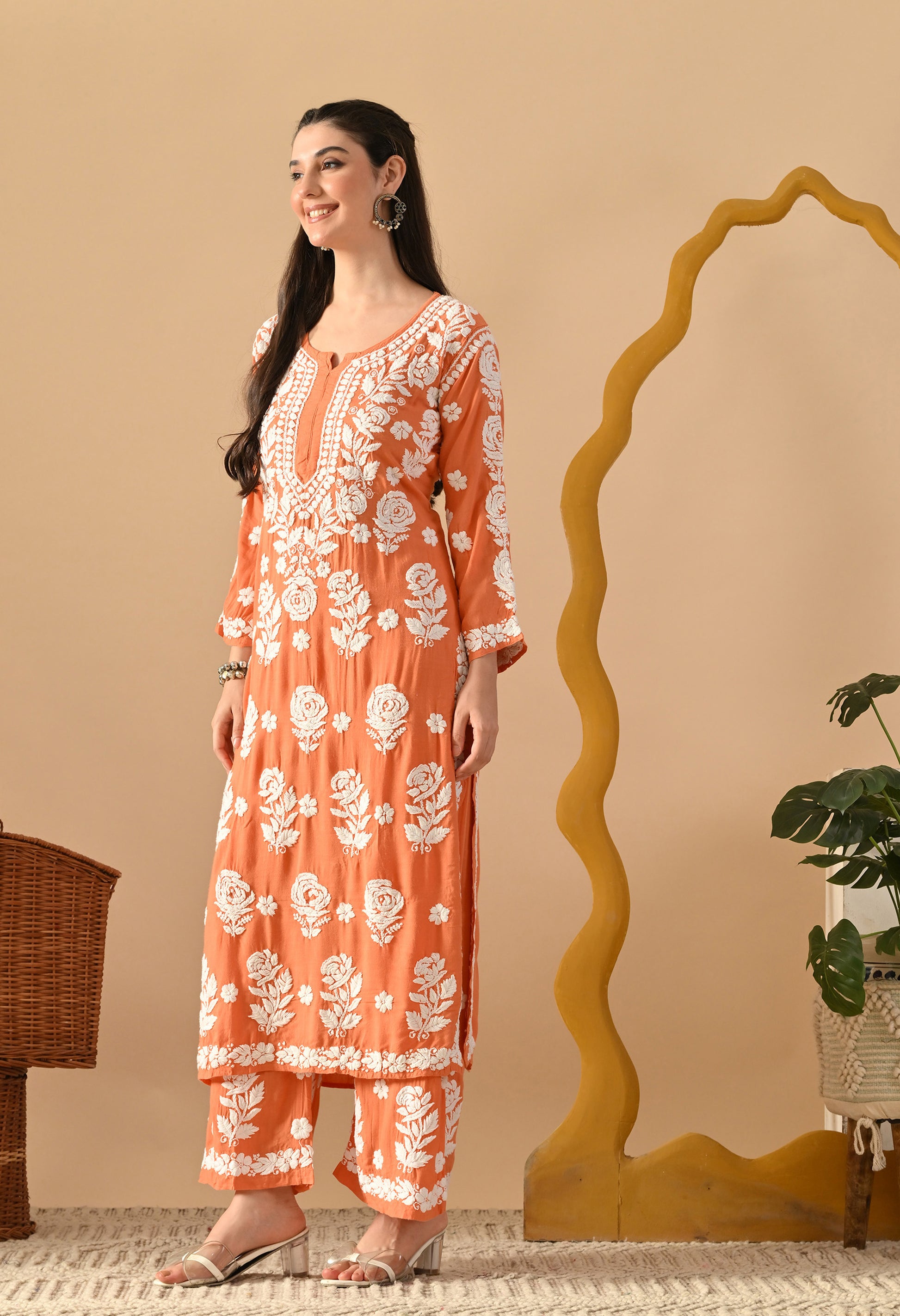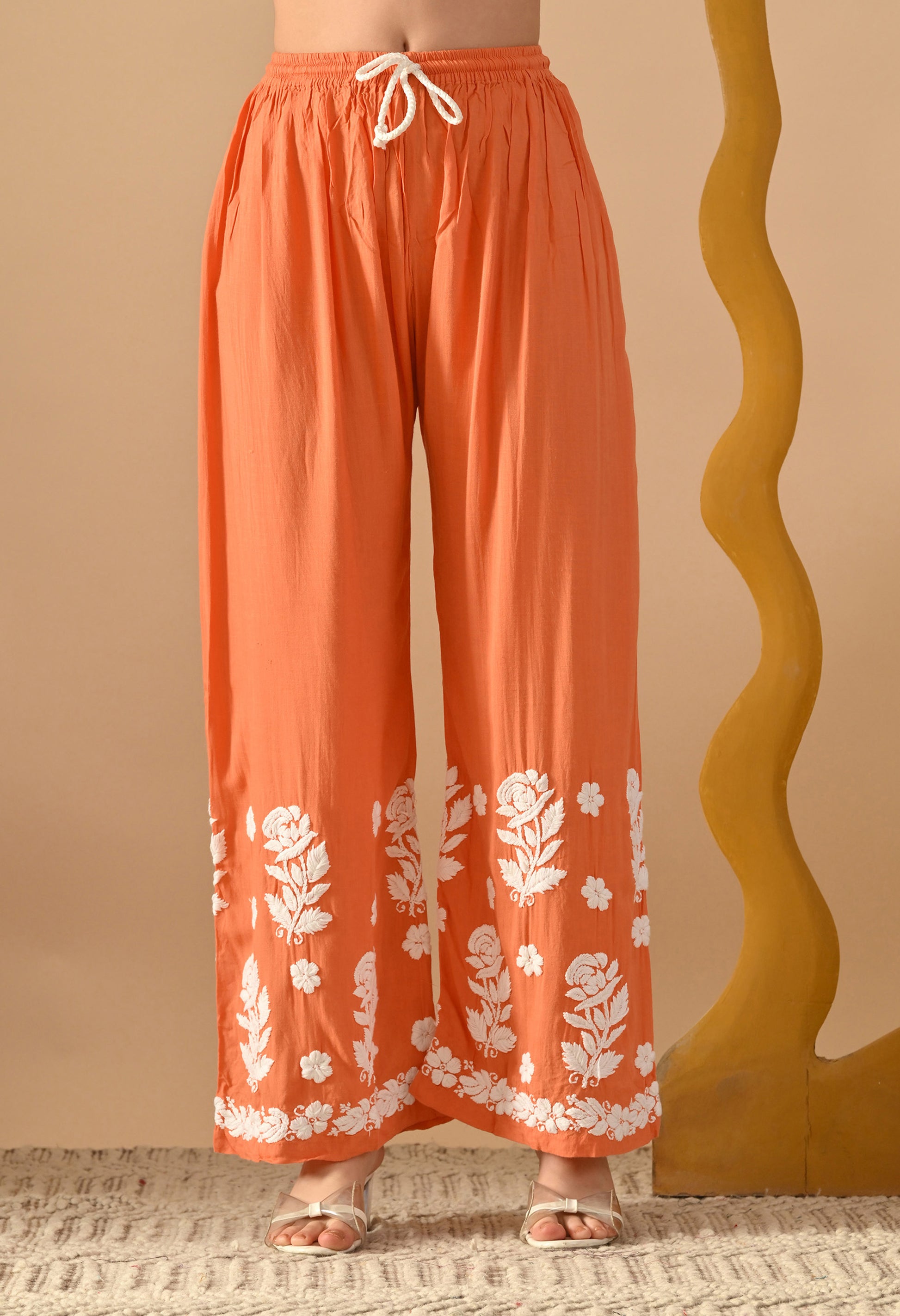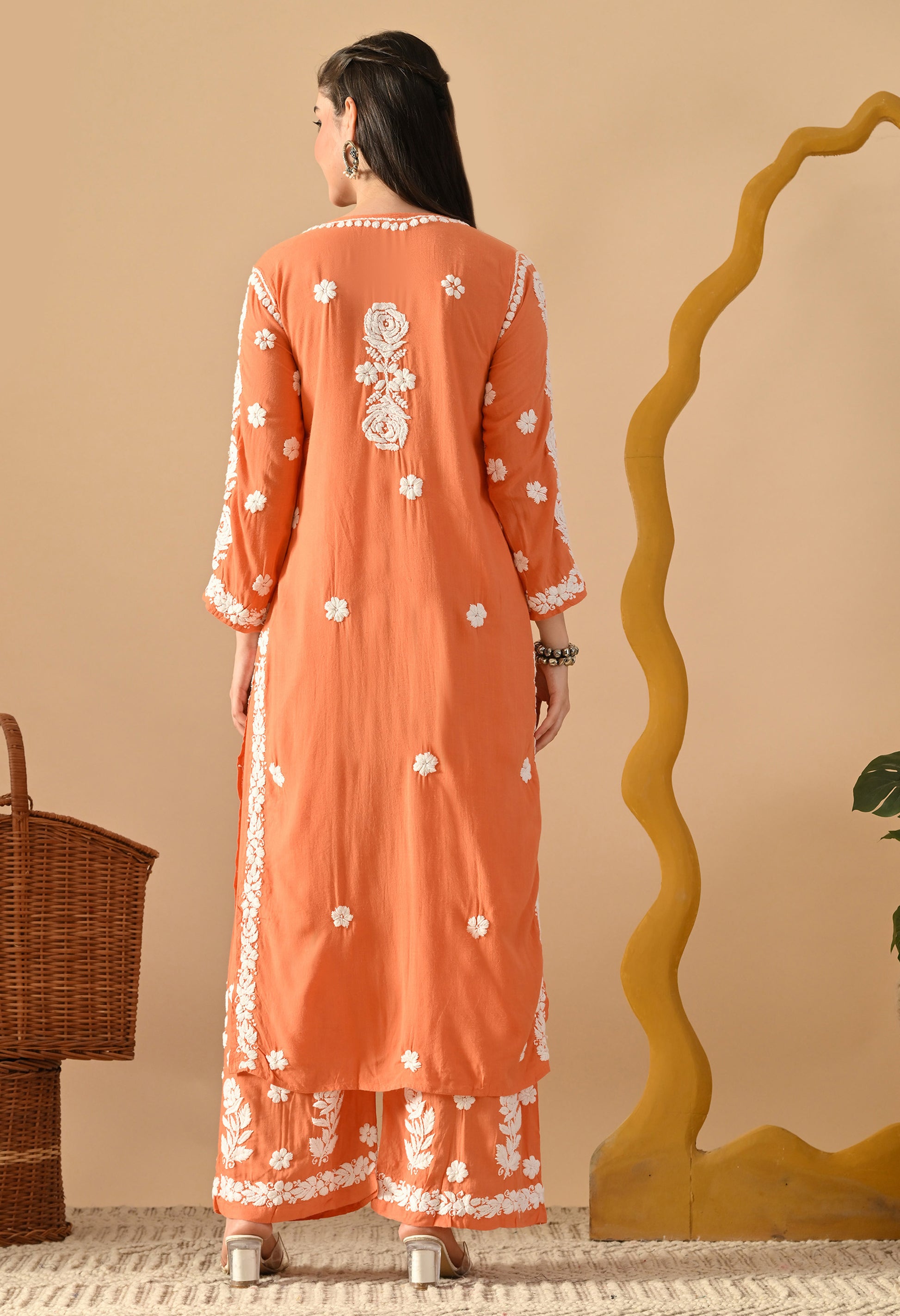 Hand Embroidered Chikankari Slub Rayon Plazo Set 3d Work-Peach
