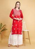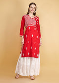 Chikankari is a traditional form of hand embroidery and Mukesh work, on the other hand, involves the use of small pieces of metallic thread, usually in silver or gold, to create embellishments and shimmering patterns on fabric.A "Flared Sarara" is a type of traditional Indian outfit that consists of wide, flared pants paired with a matching top or kurta.hand-embroidered Chikankari Flared Sarara with Mukesh Work is a stunning and elegant traditional Indian outfit that combines intricate embroidery and metallic accents to create a visually appealing and graceful ensemble, perfect for various special occasions.