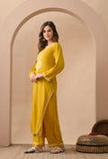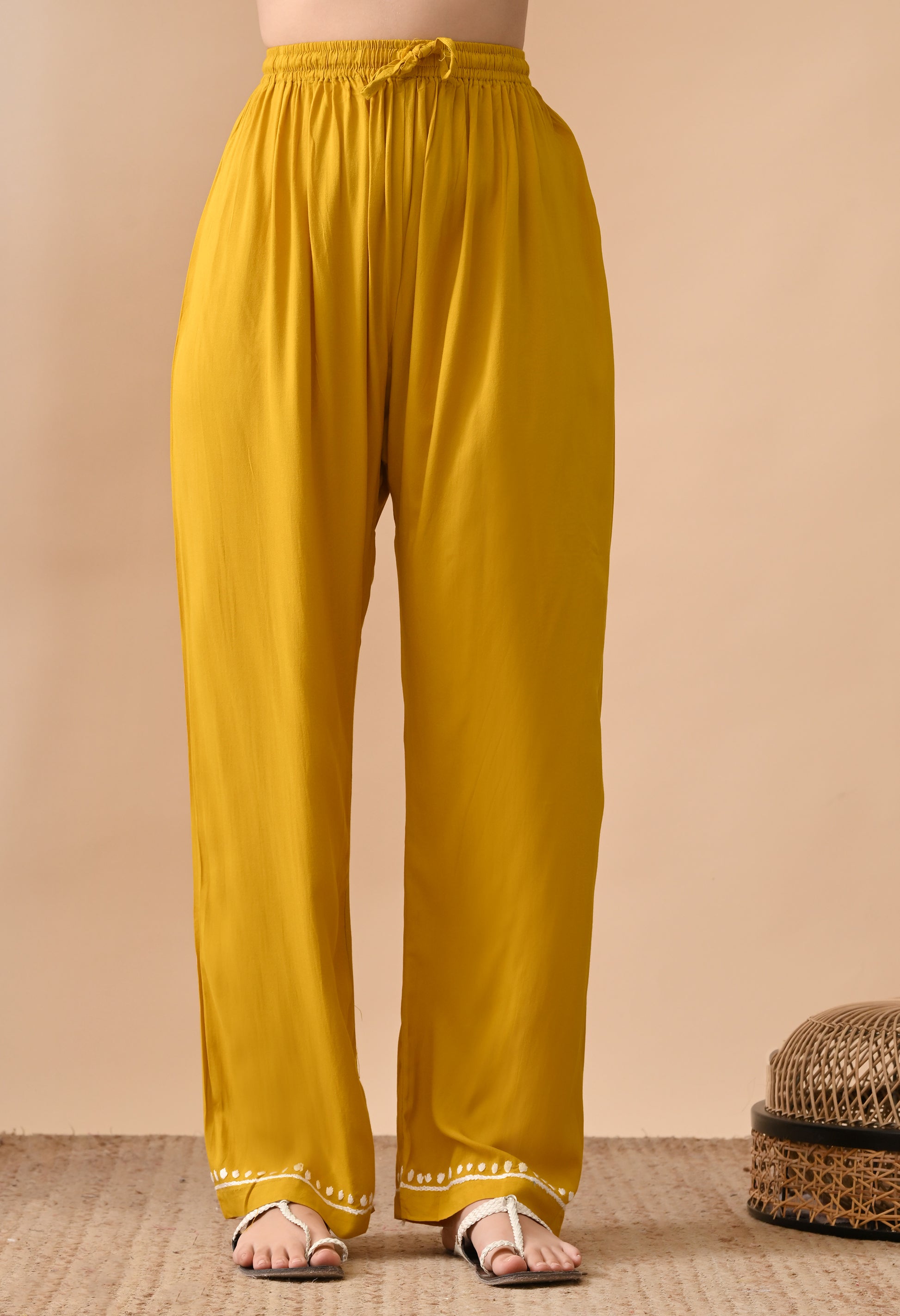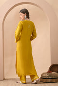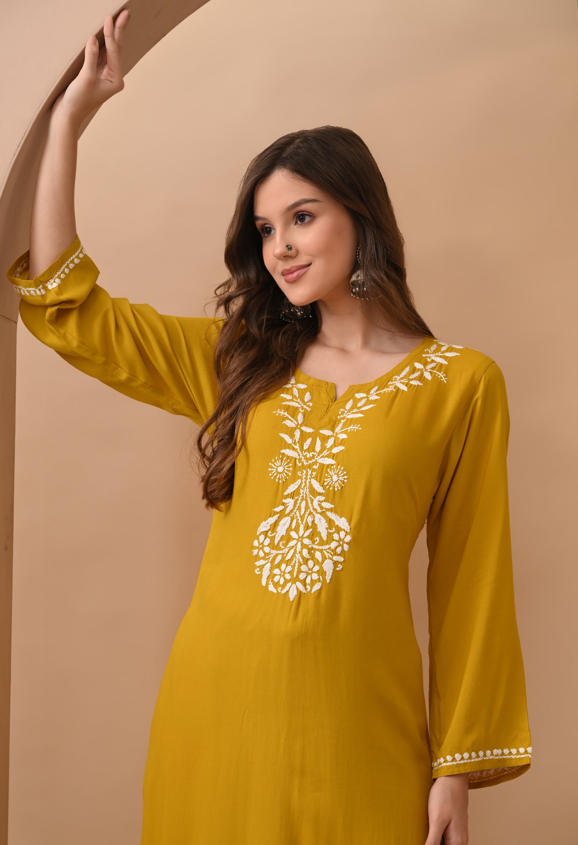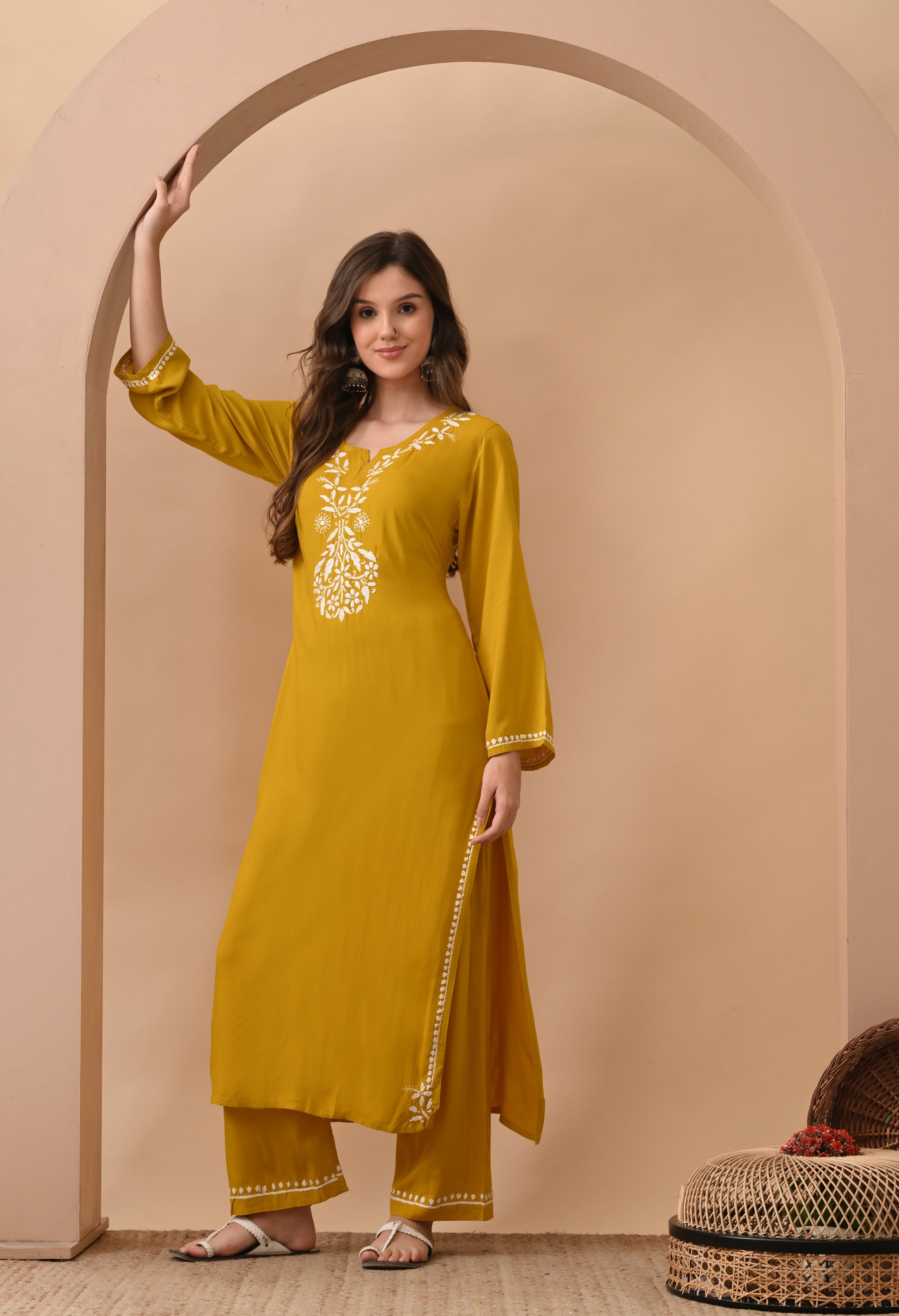 Hand-embroidered Lucknowi Chikankari Kurta Plazo Set – Mustard Yellow & White