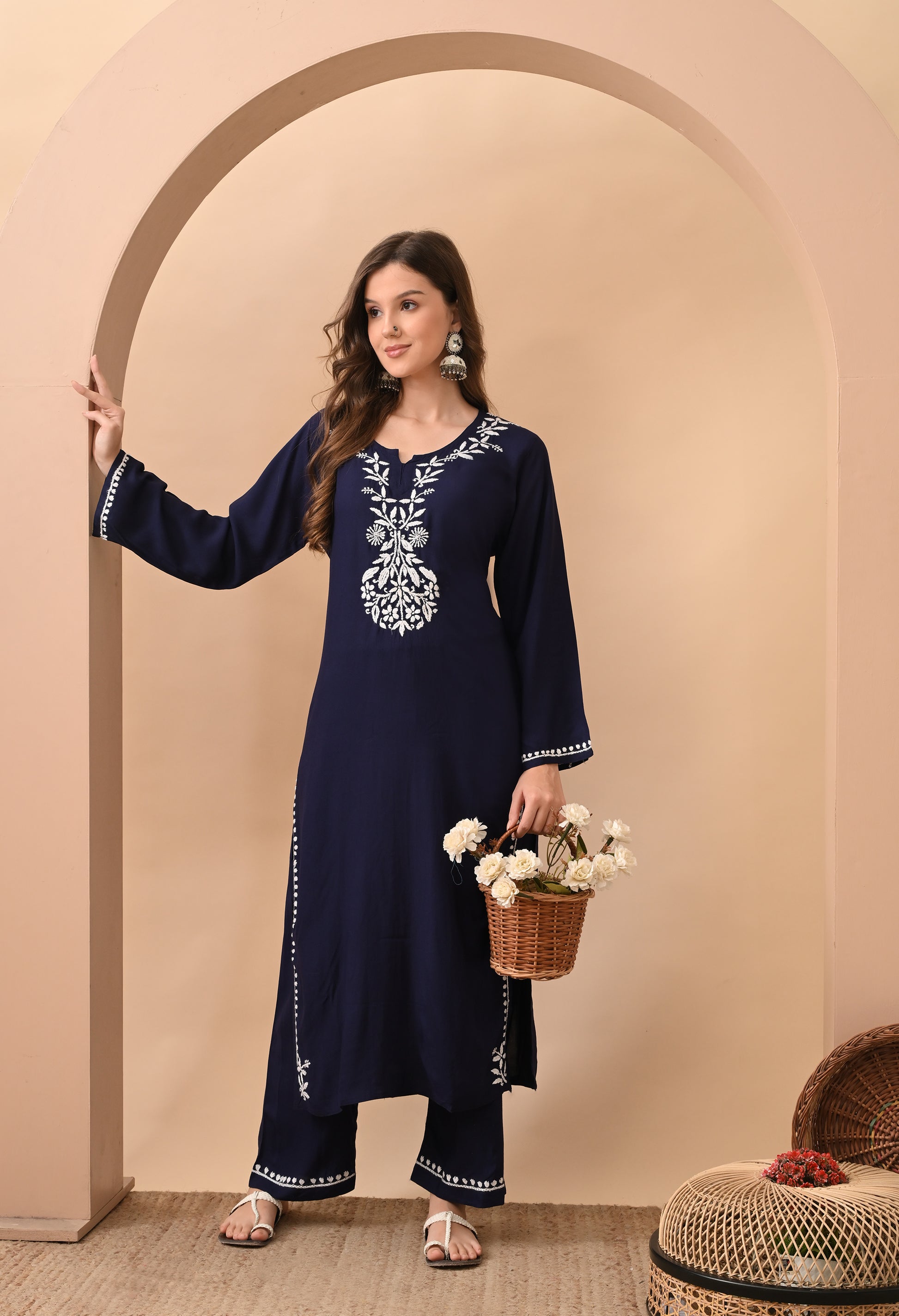 Elevate your ethnic wardrobe with this elegant rayon kurta pant set, beautifully adorned with traditional Lucknowi chikankari embroidery.