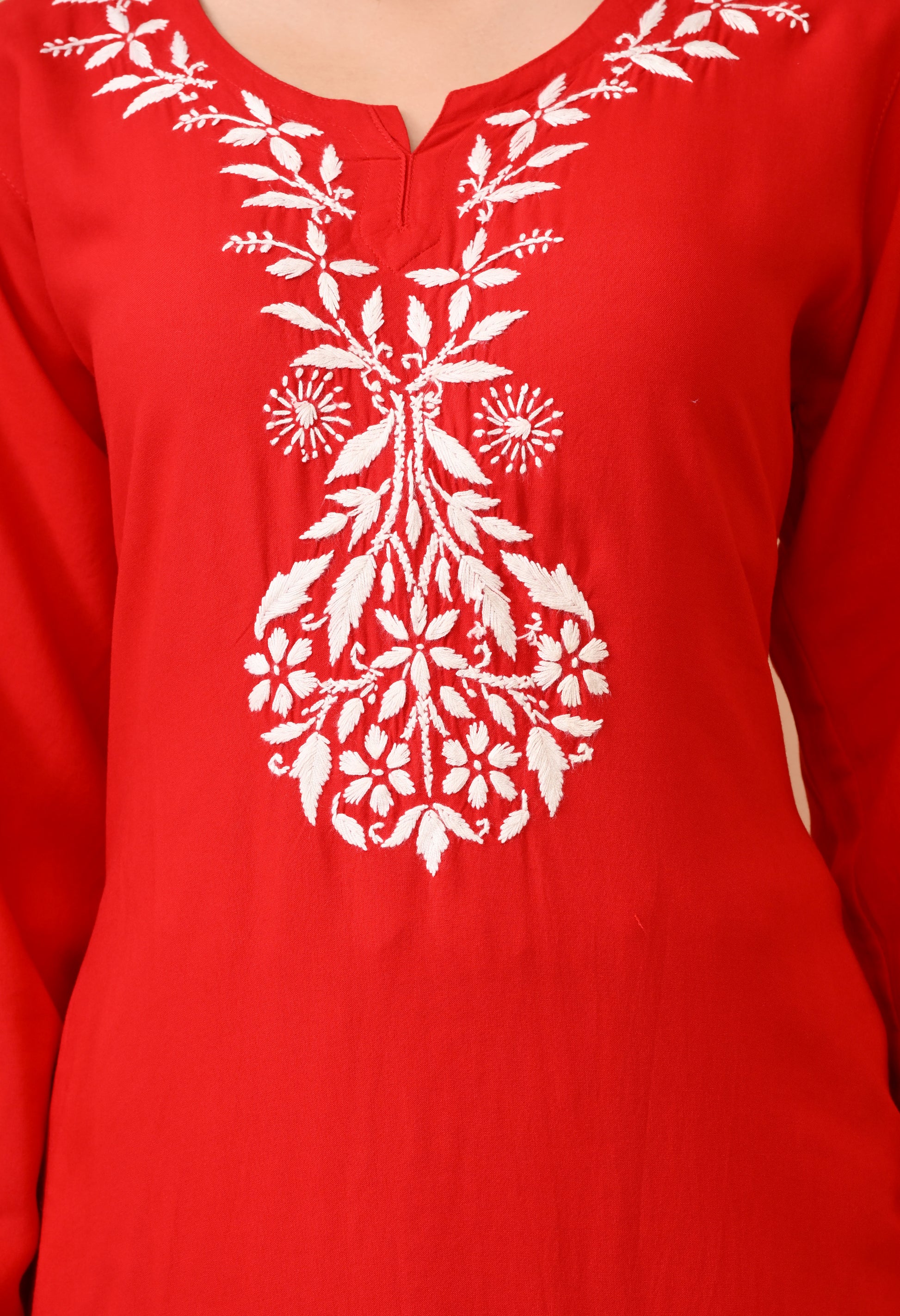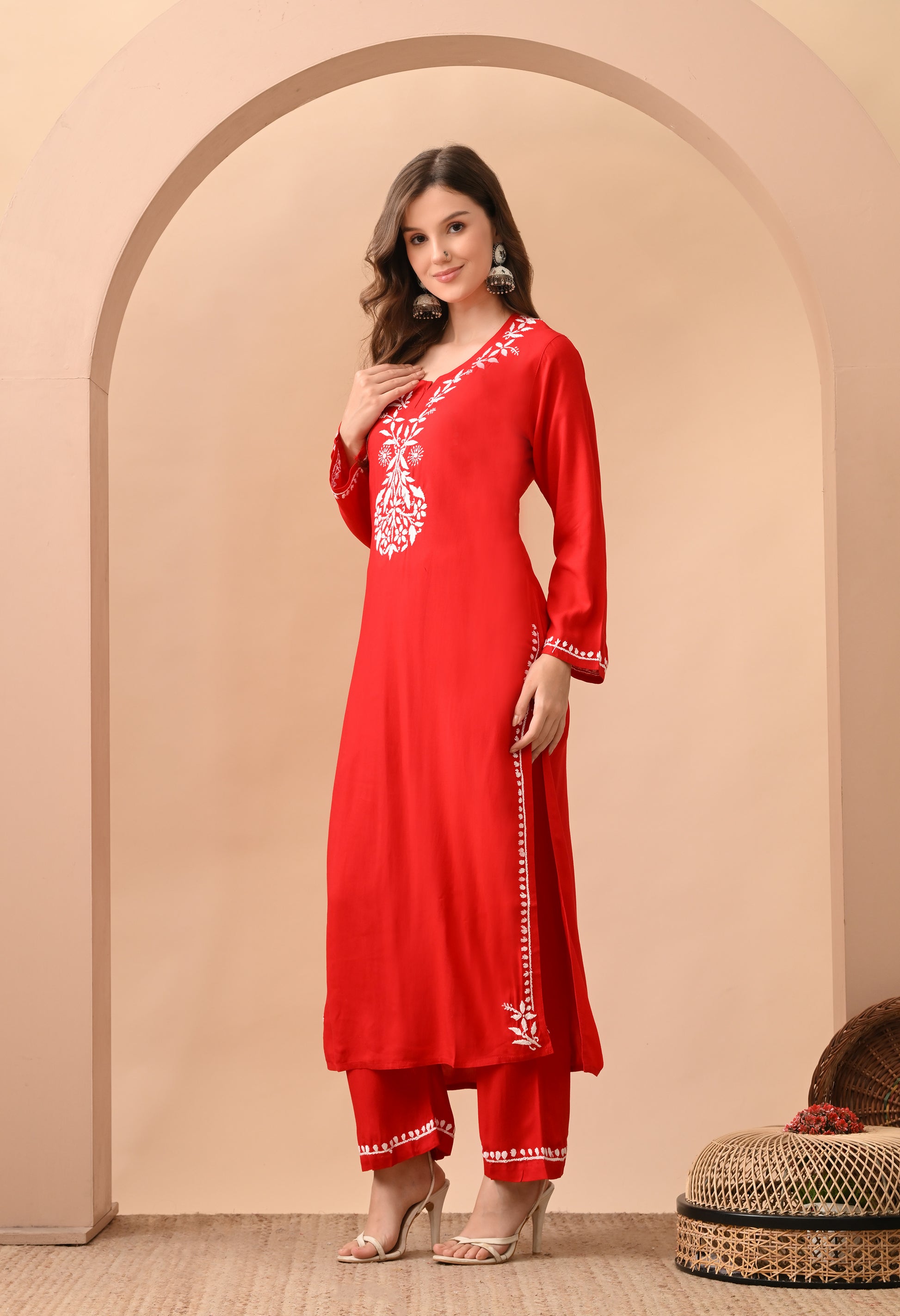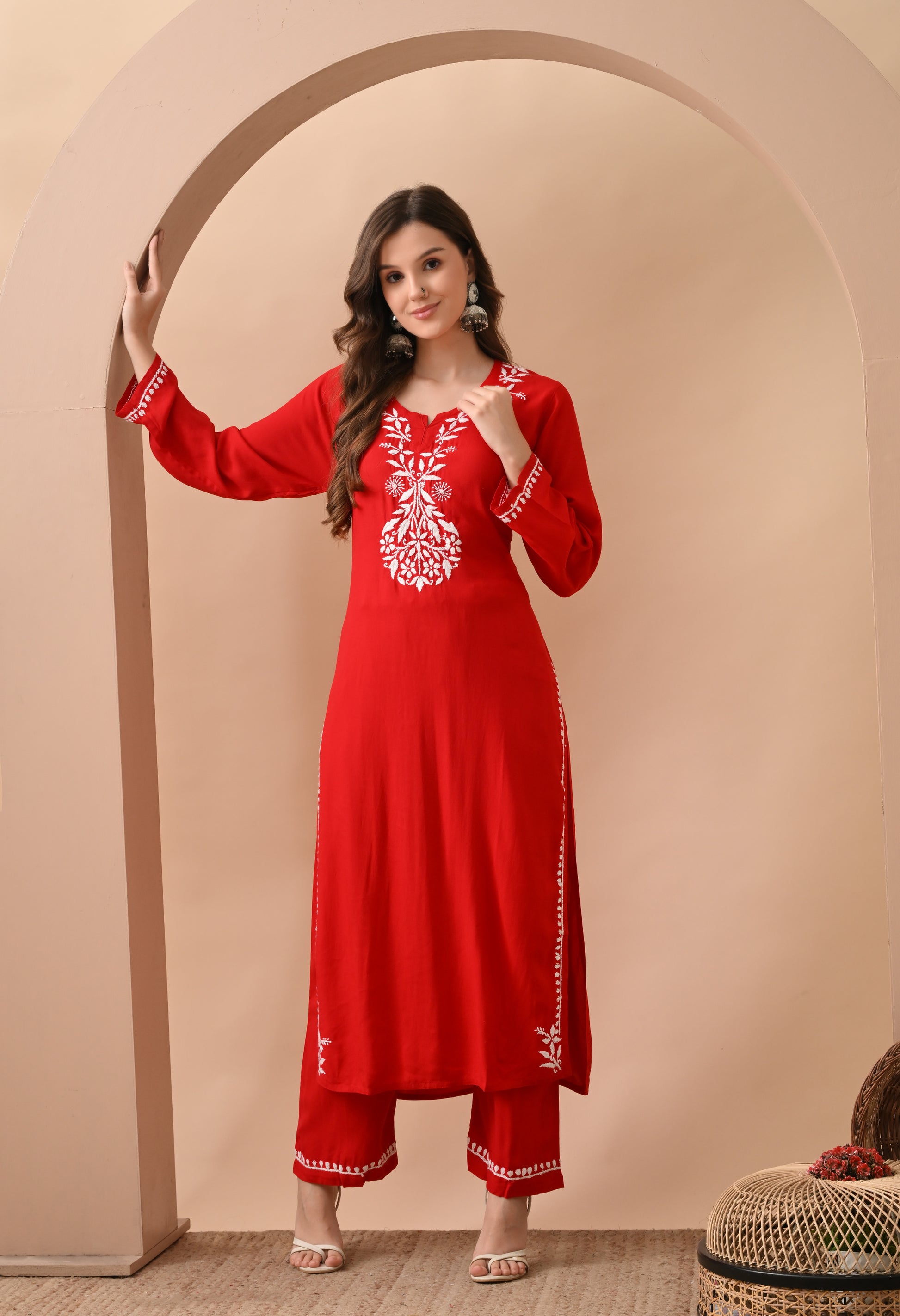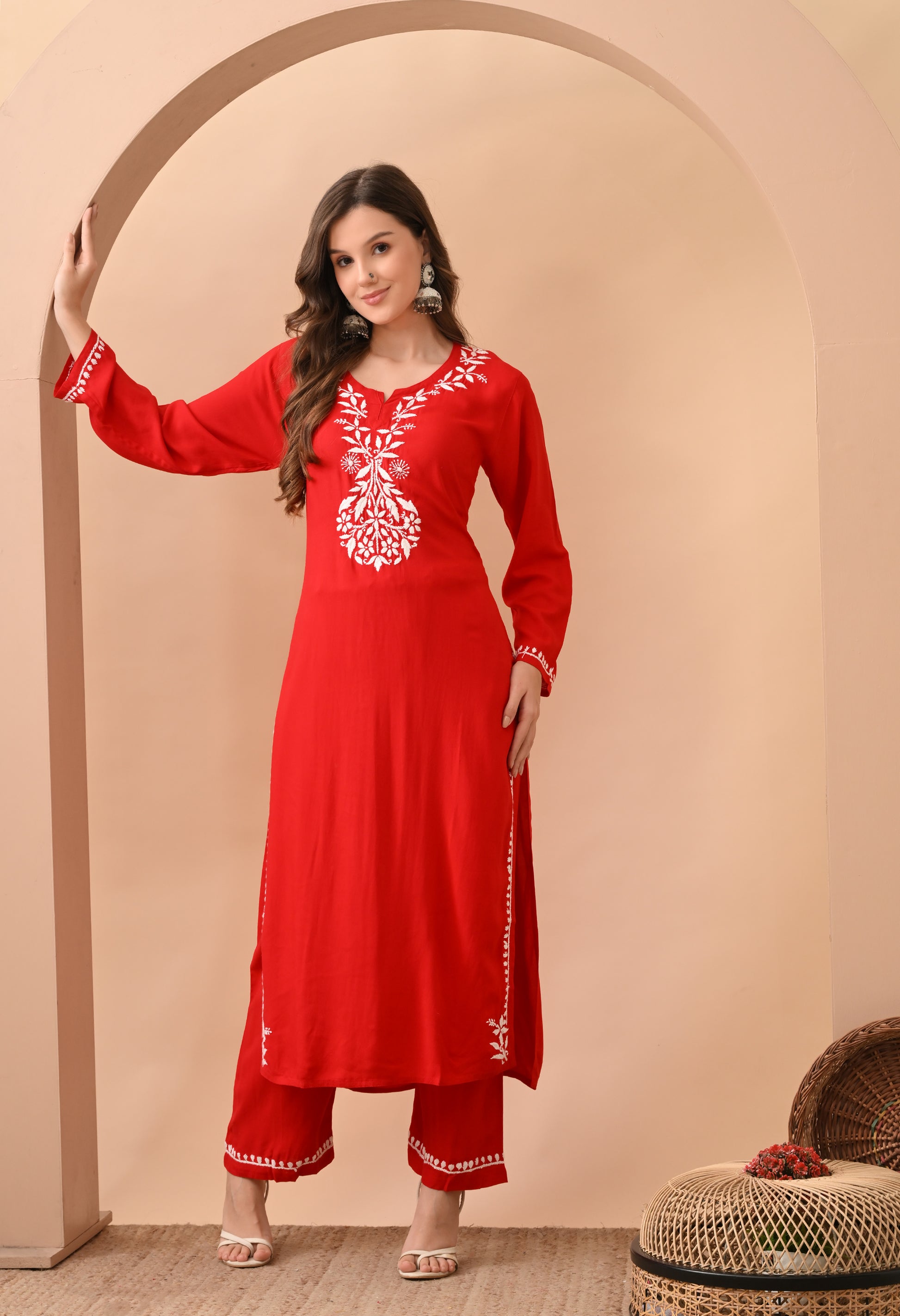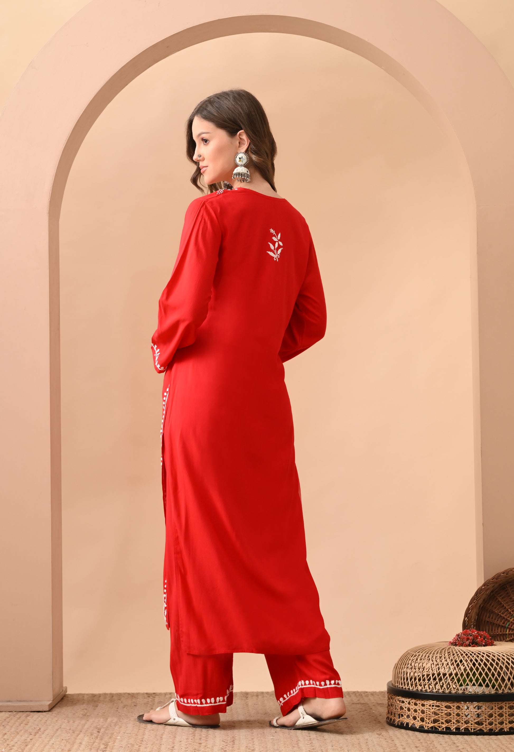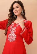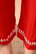 Hand-embroidered Lucknowi Chikankari Kurta Plazo Set – Red & White